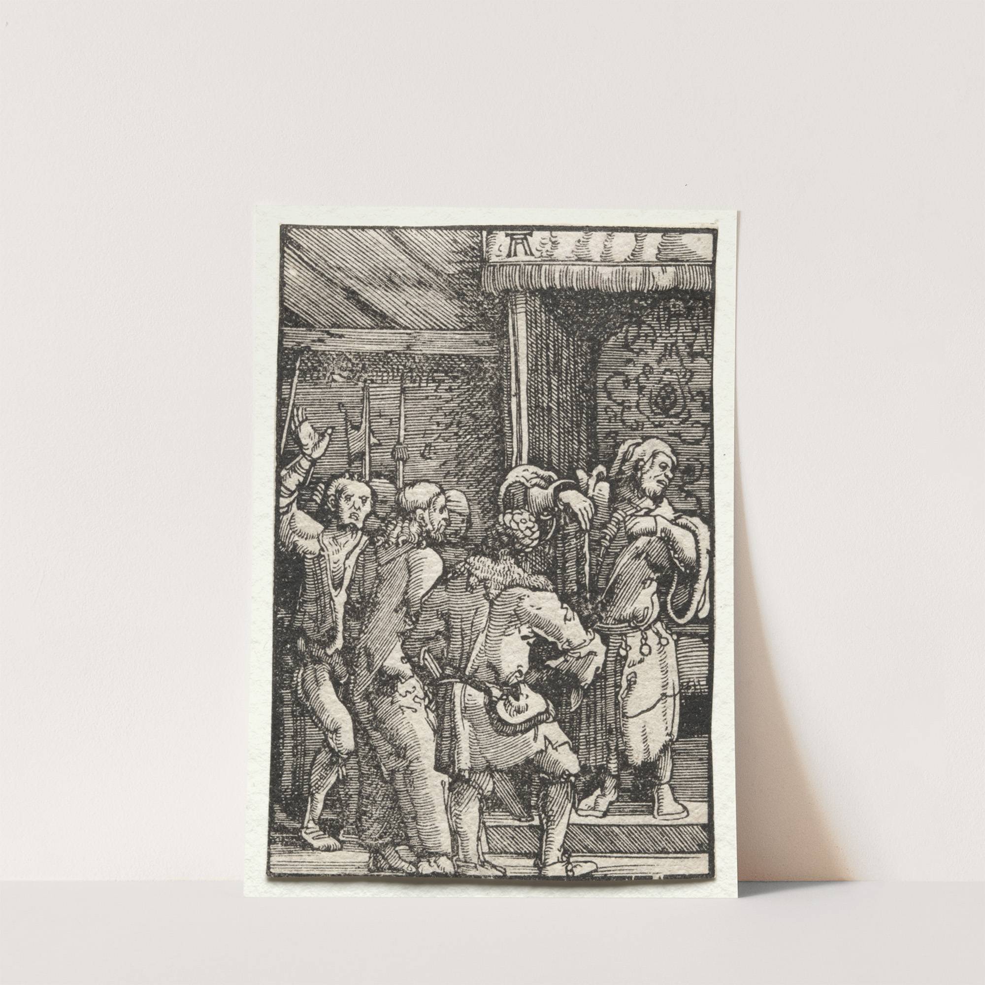This black-and-white etching depicts a dramatic scene from historical art, titled "Christ Before Caiaphas" by Albrecht Altdorfer. The composition is rich with intense line work and shadowing that create a strong sense of depth and movement. At the center, Jesus...