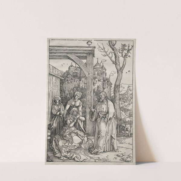 This exquisite black-and-white woodcut print by Albrecht Dürer depicts "Christ Taking Leave of His Mother." The scene is set within a humble, rustic courtyard framed by a simple wooden structure. On the left, three women in period attire stand sorrowfully,...
