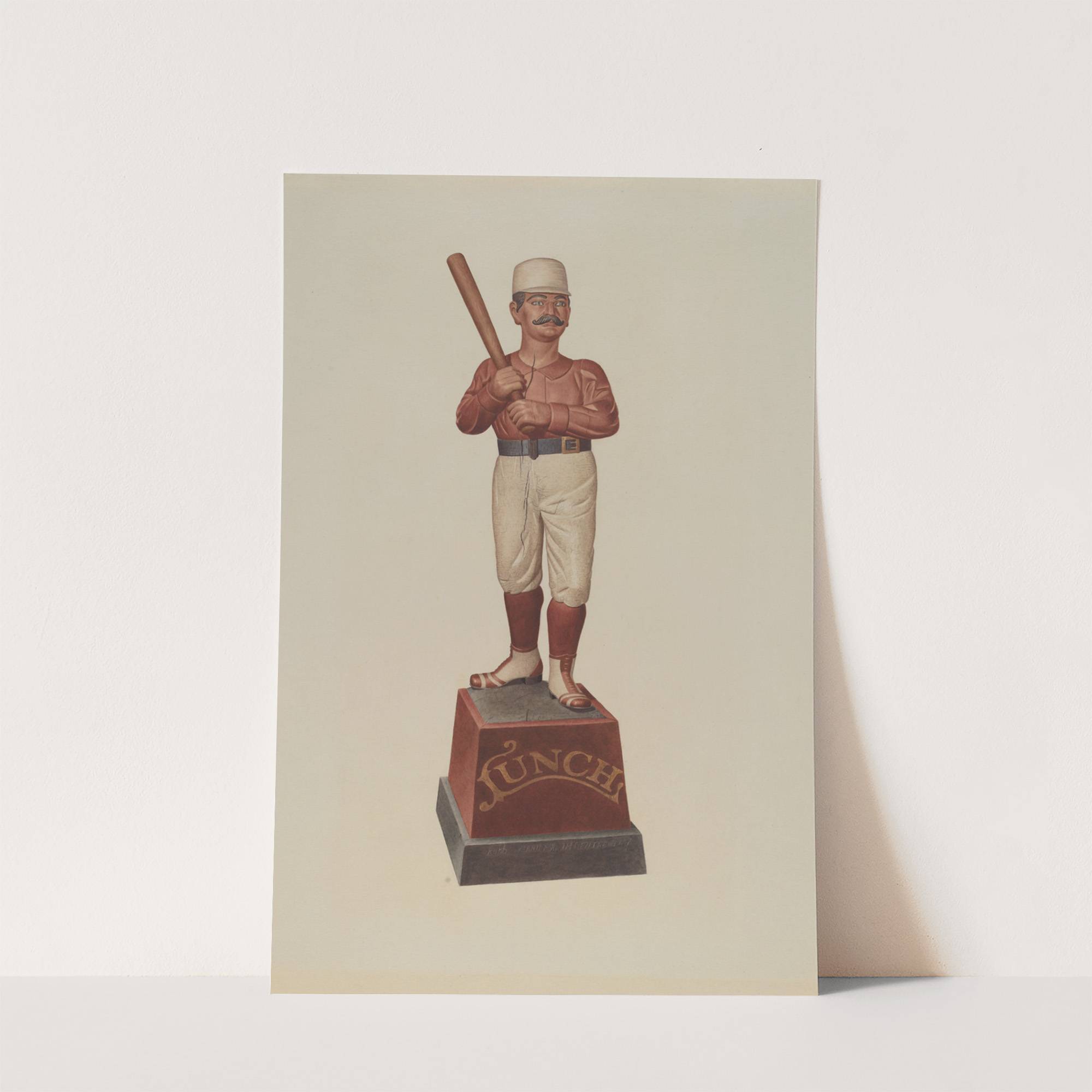 This artwork, titled "Cigar Store Figure – Ball Player" by Albert Ryder, features a vintage-style figurine of a baseball player standing proudly on a rectangular base. The ball player is depicted in a traditional early 20th-century baseball uniform, consisting of...