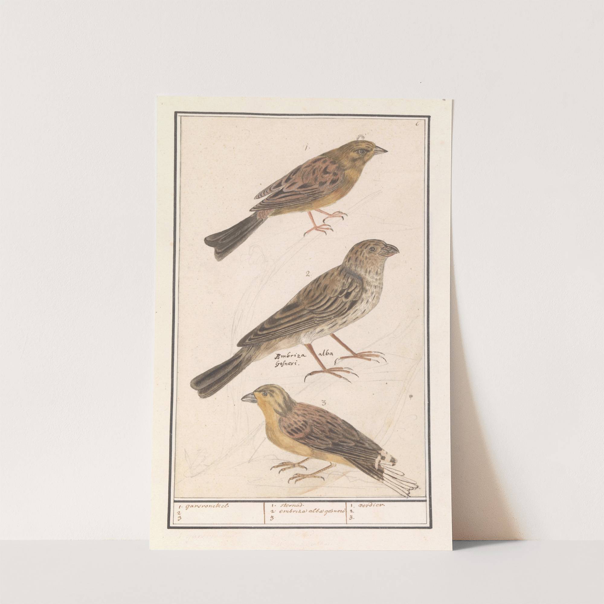 Cirlgors (Emberiza cirlus), grauwe gors (Emberiza calandra) en een geelgors (Emberiza citrinella) (1596-1610) by Anselmus Boëtius de Boodt - Wall Art Print