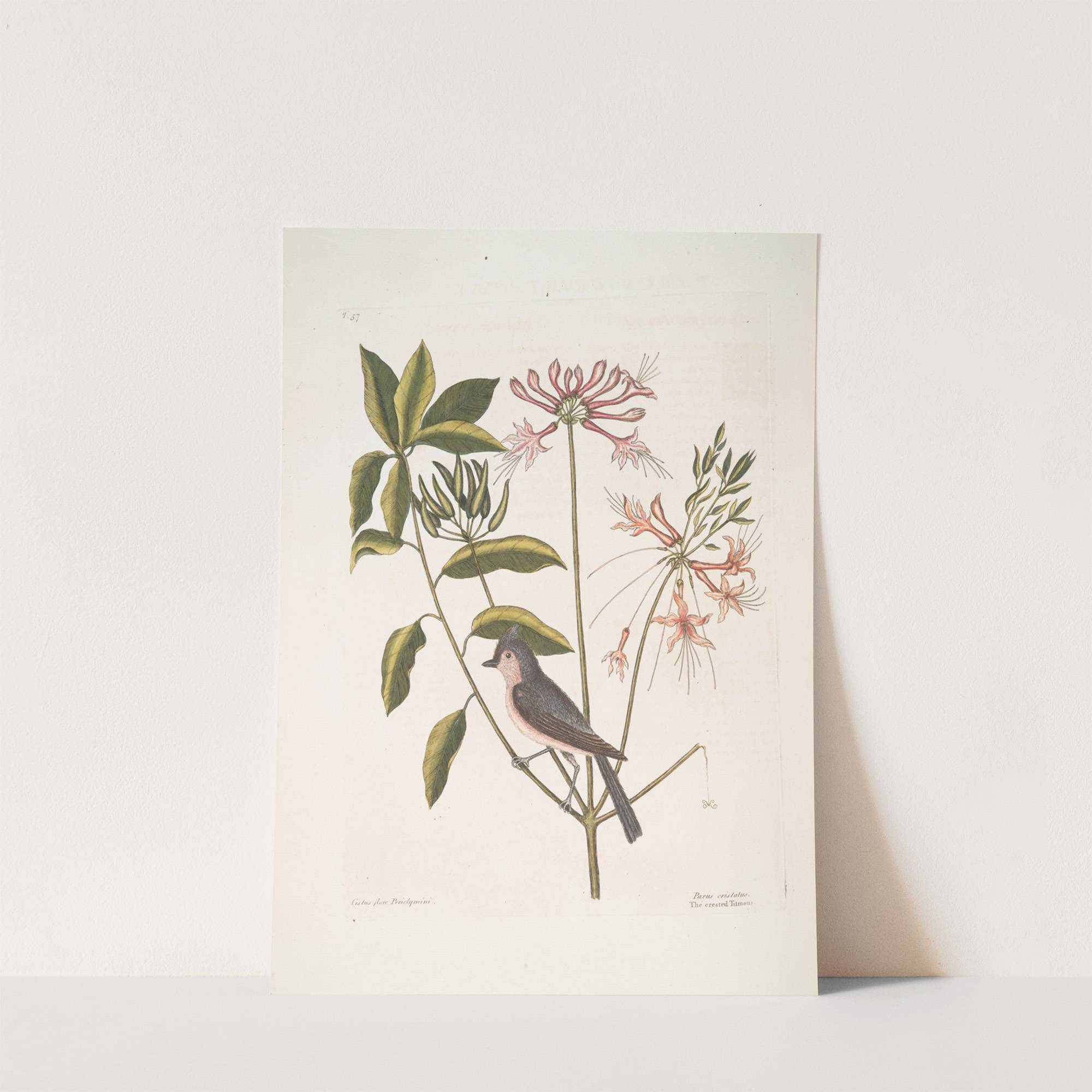 Cistus flore Periclymini, The Upright Honysuckle; Parus cristatus, The crested Titmous. by Mark Catesby - Wall Art Print