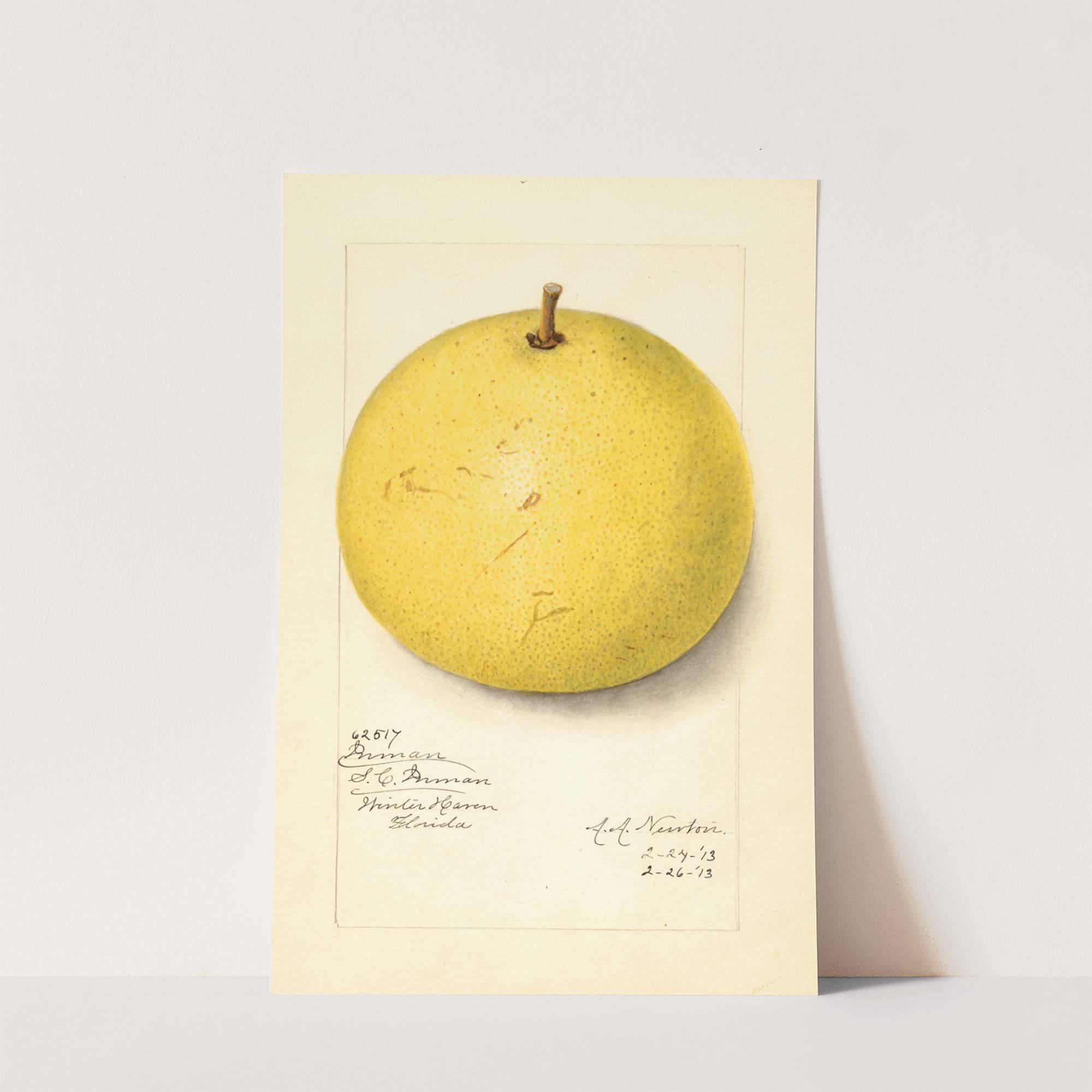Introducing "Citrus paradisi: Inman" by Amanda Almira Newton – a striking and detailed art print featuring a single yellow grapefruit centered against a stark white background. The grapefruit is portrayed in realistic colors, capturing the subtle variations of its yellow-green...