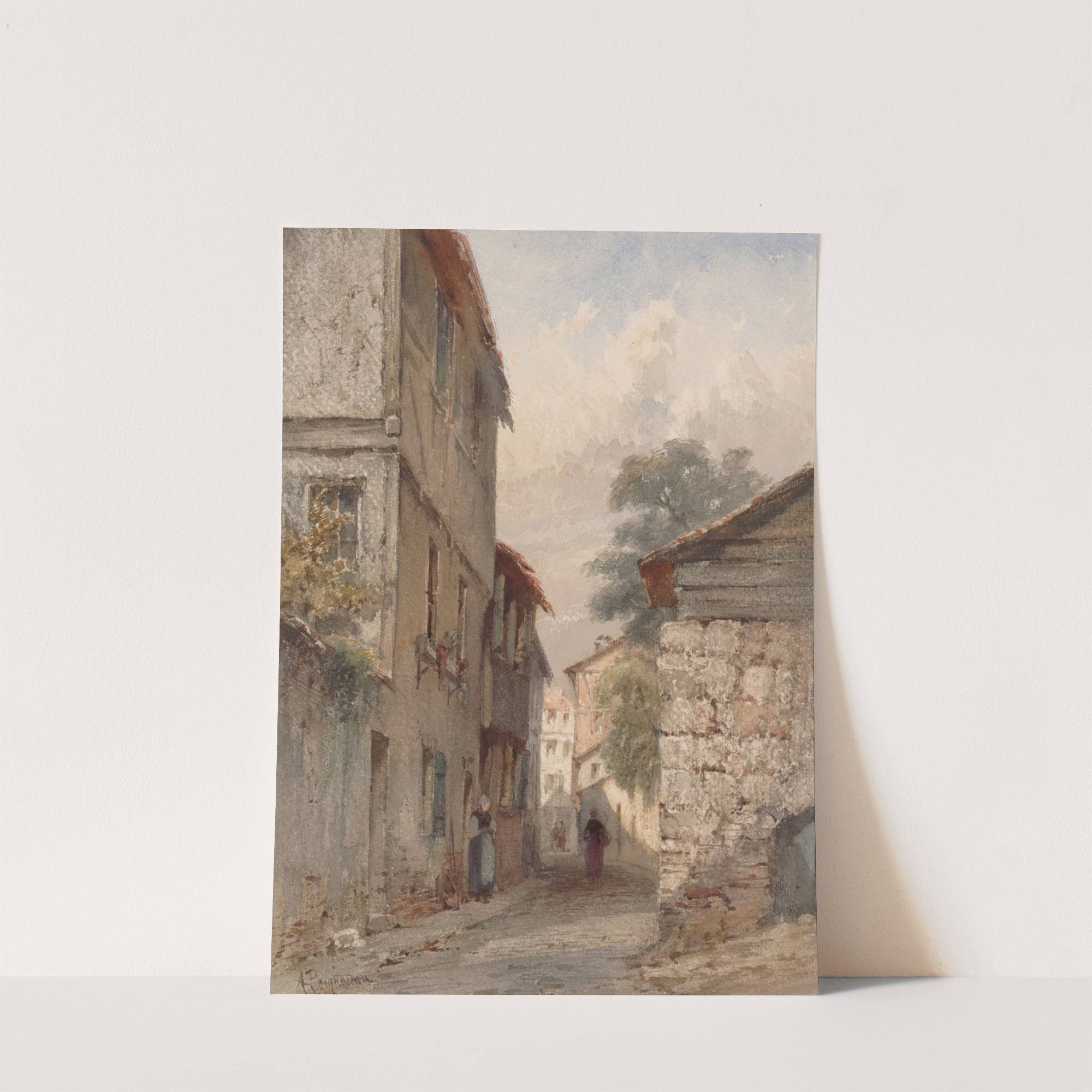 This artwork titled "Cityscape" by Alphonse Pecqueur captures a serene, rustic street scene in a charming European village. Painted with delicate brushstrokes and a soft, muted color palette, the scene conveys an atmosphere of timeless tranquility. The foreground features weathered...