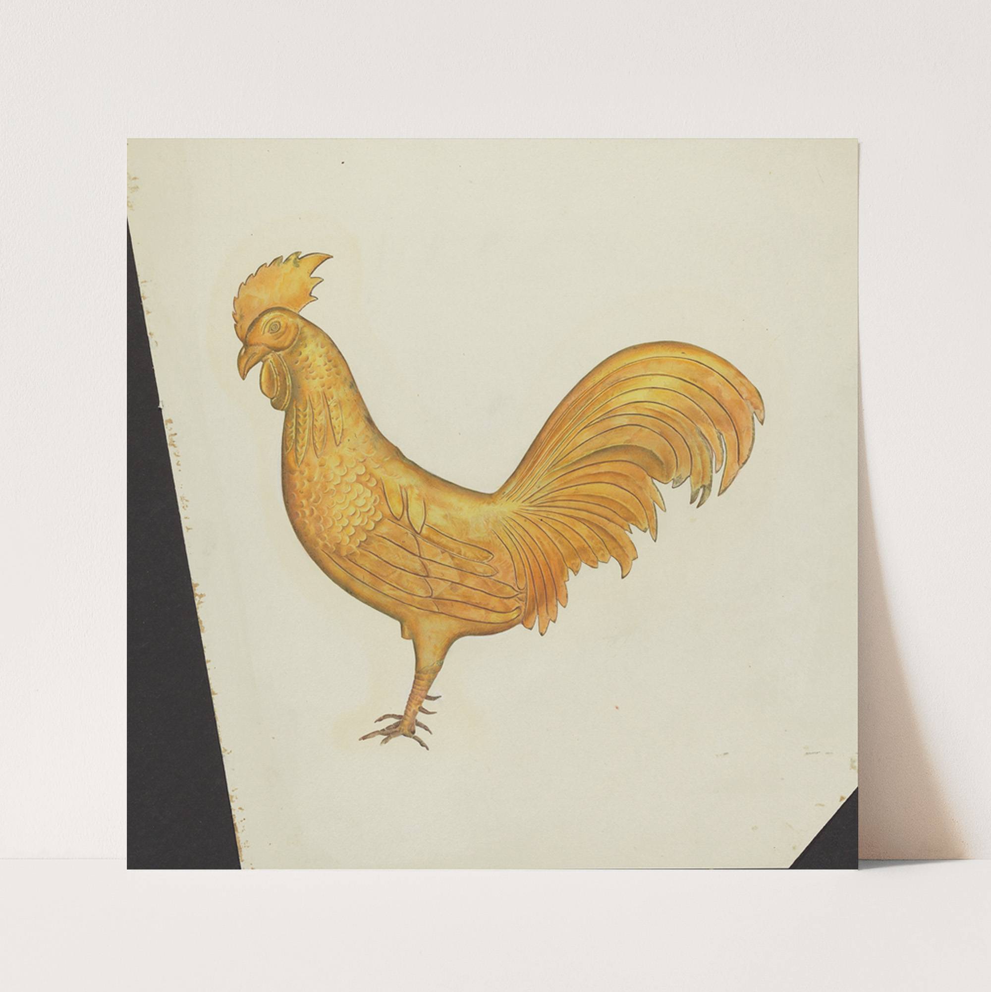 This vibrant art print features a meticulously detailed rooster illustration in shades of golden yellow and warm orange. The rooster is shown in profile, standing proudly on its strong legs with an elegant, slightly curved posture. Its feathers are intricately...