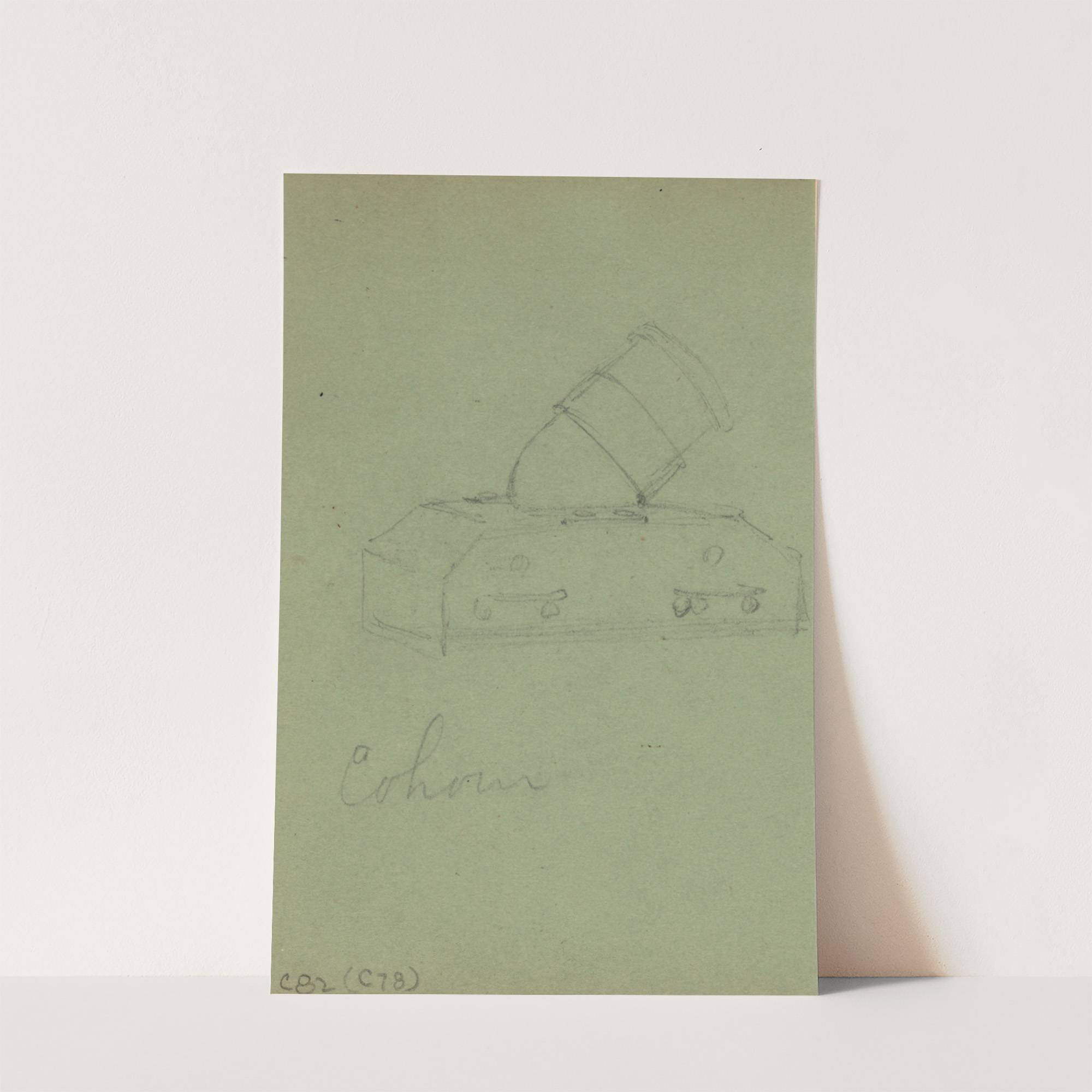 This piece is an intriguing pencil sketch by the artist Alfred Rudolph Waud, titled "Edison." It features a minimalist yet recognizable depiction of an early phonograph machine with a conical horn extending upward from its rectangular base. The lines are...