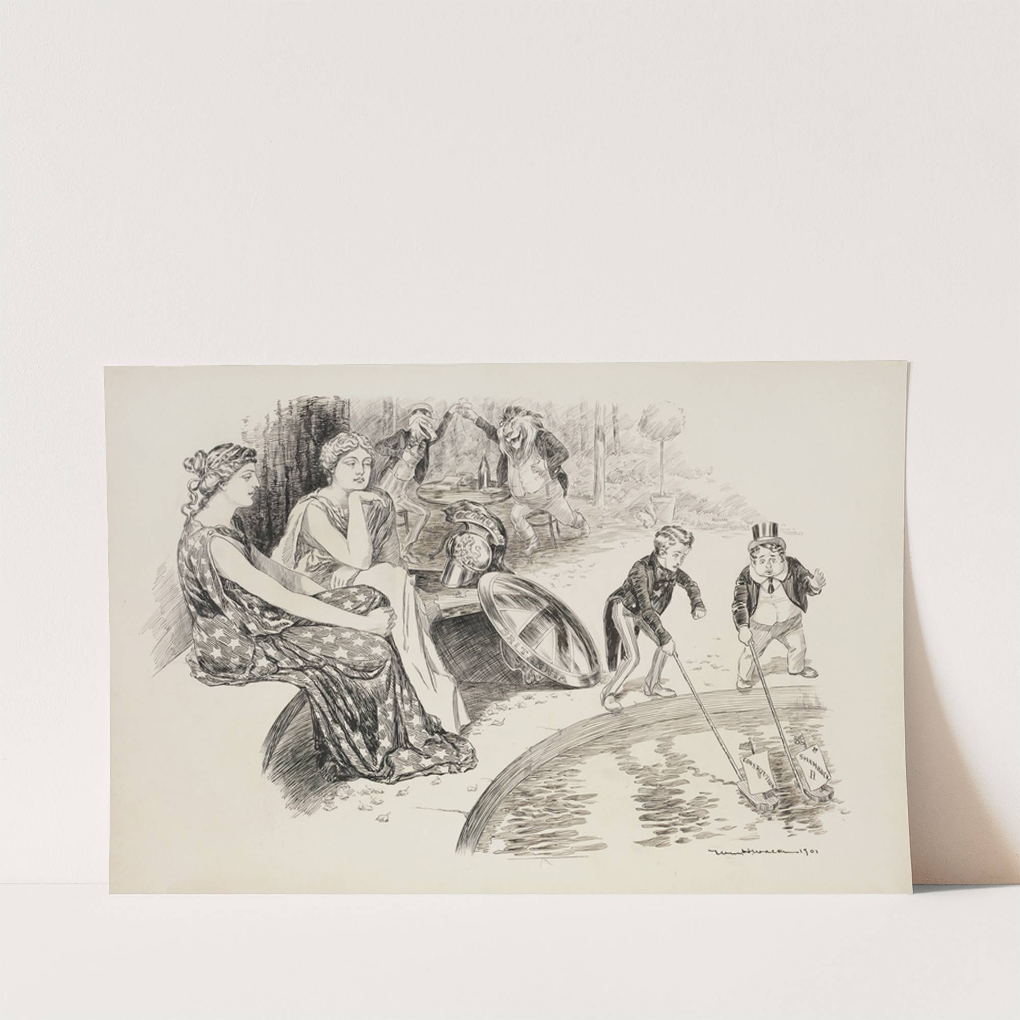 Columbia and Britannia watch two boys, representing the United States and Great Britain, play with boats in the water (1901) by William Henry Walker - Wall Art Print