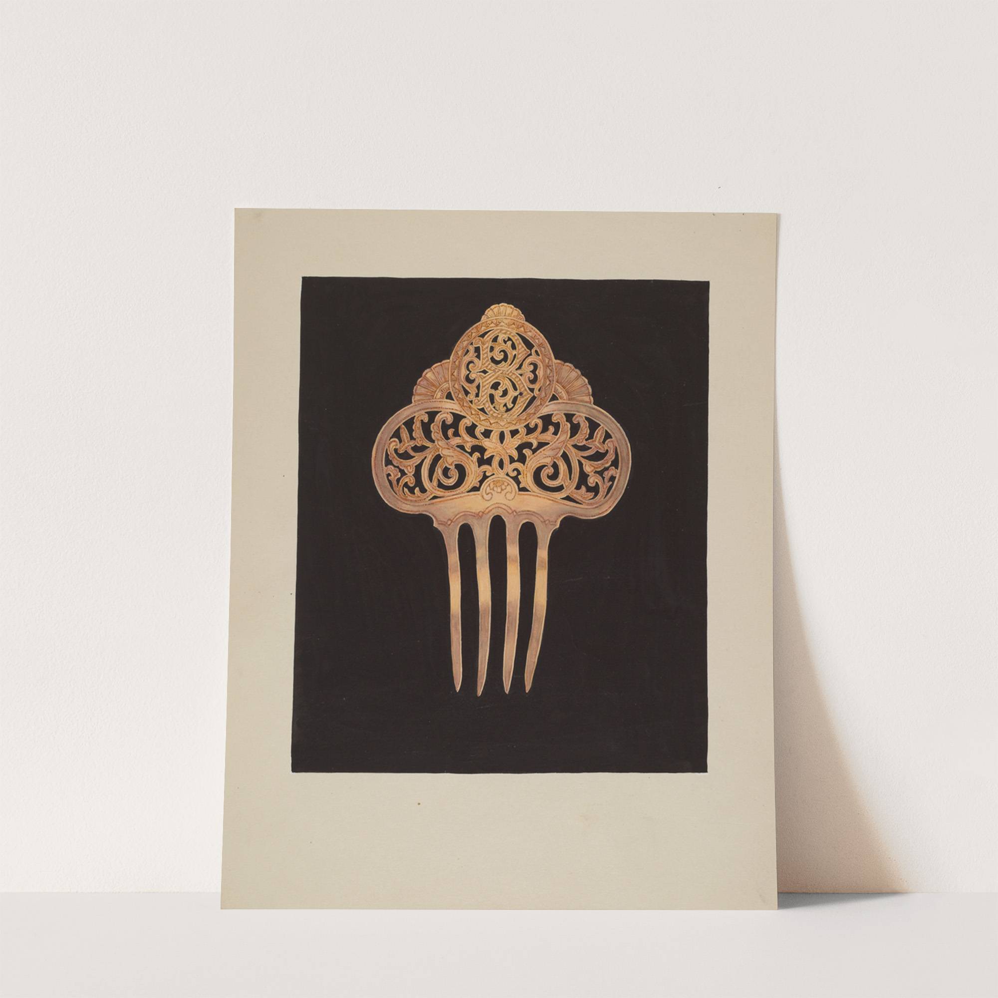 This art print features a striking abstract design by artist Harry Jennings, titled "Comb." The artwork showcases a intricate pattern that resembles the shape of a comb, with delicate, swirling motifs at the top transitioning into sleek, vertical lines that...