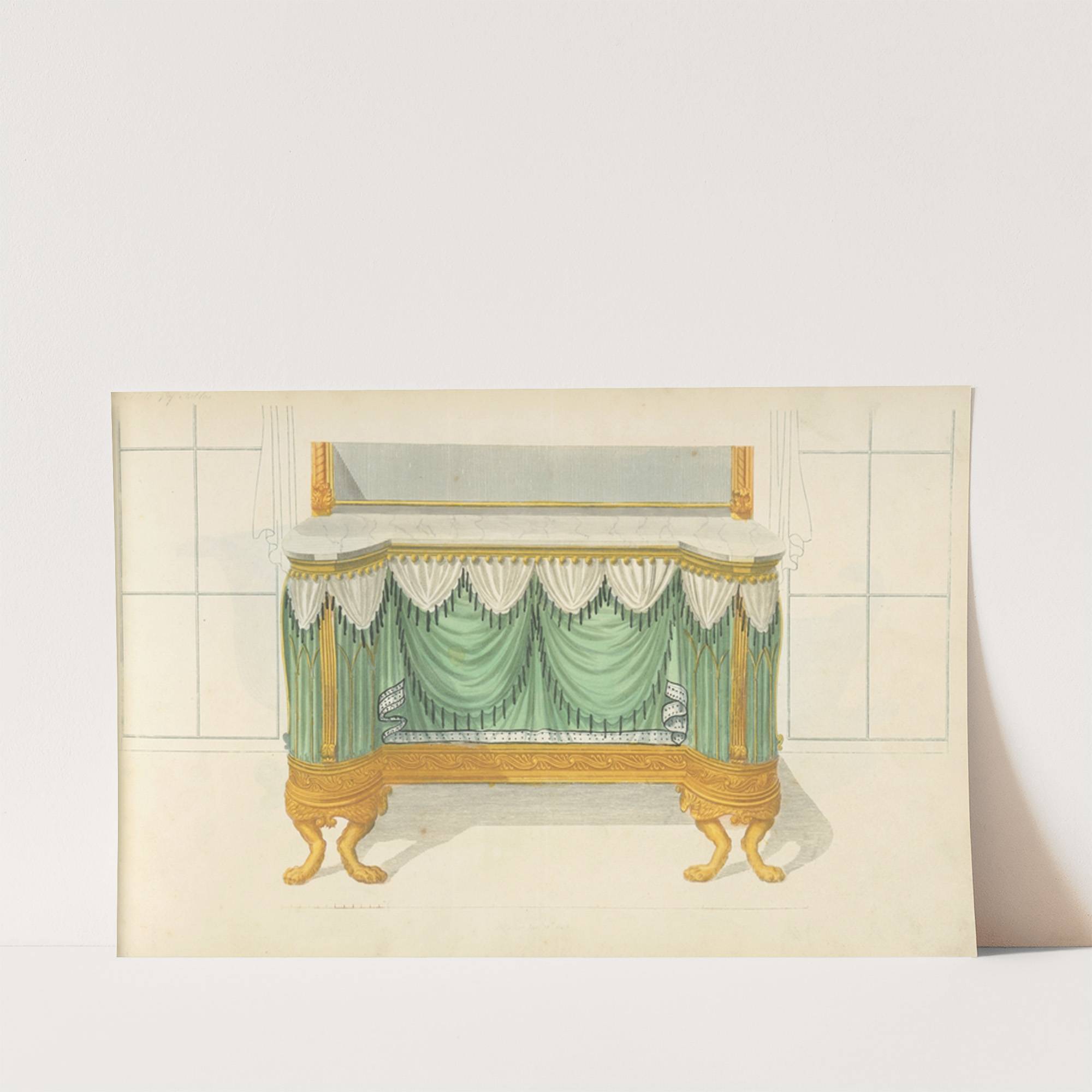 Commode or sideboard with green drapery. by Thomas Sheraton - Wall Art Print