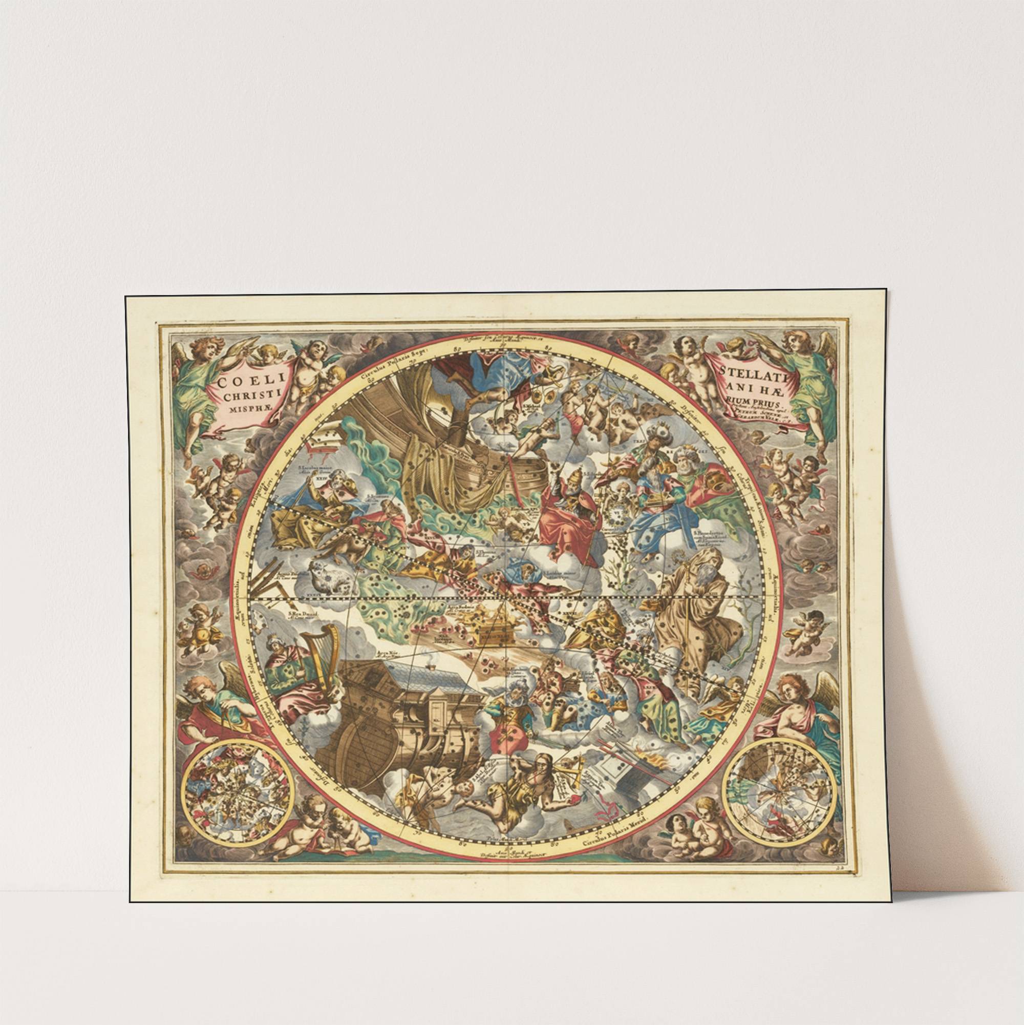 This exquisite print features "Constellations according to Christian symbolism" by Andreas Cellarius, showcasing a vibrant and intricate celestial representation rich in Christian iconography. The circular composition is densely packed with detailed illustrations of various biblical scenes and characters, encircled by...