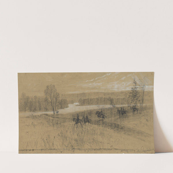 This captivating print features "Corbin's Neck on the Rappahannock" by Alfred Rudolph Waud. The artwork beautifully captures a tranquil winter landscape scene with subtle hues of gold and beige. Sparse trees, some leafless, are scattered across the gently rolling hills...