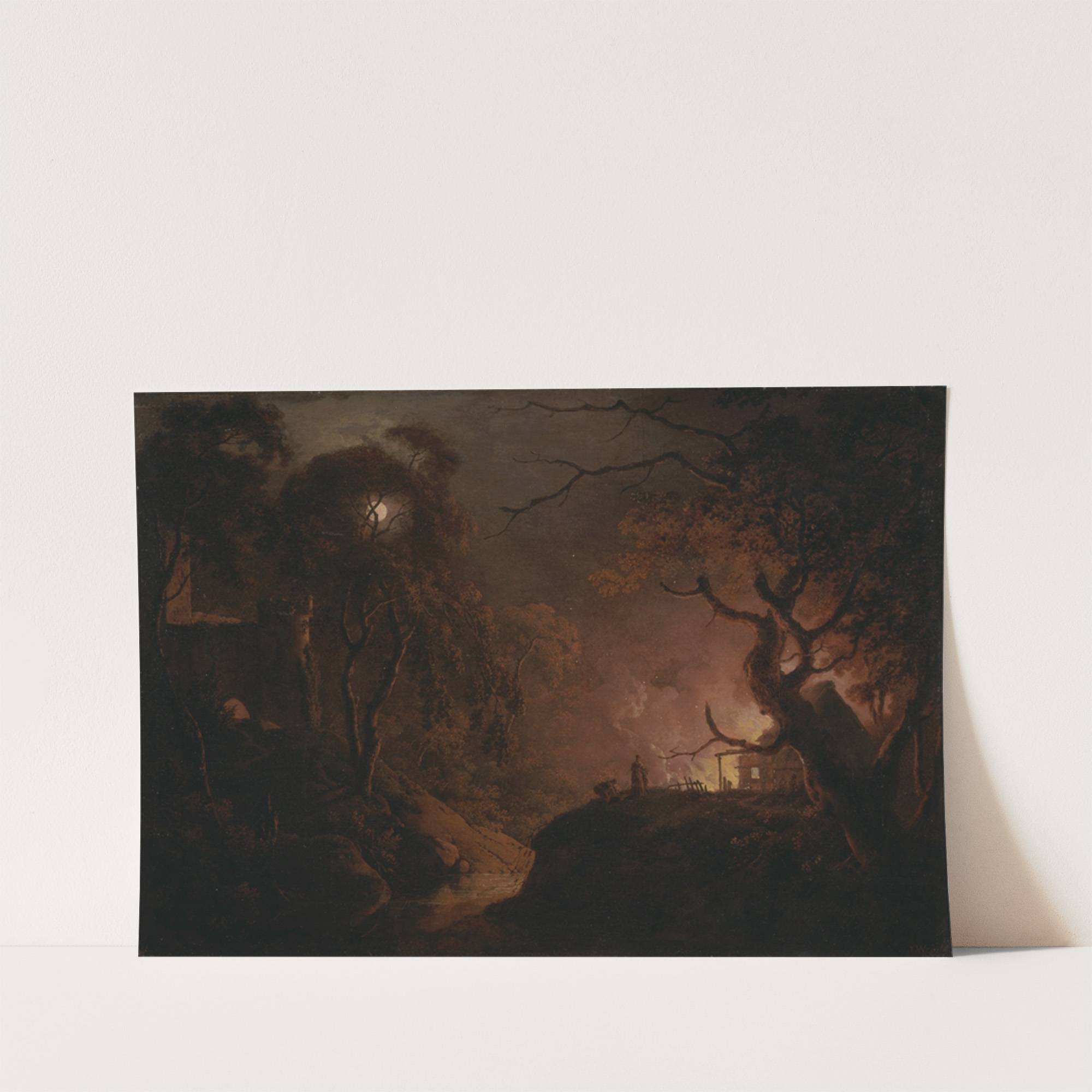 Cottage on fire at night by Joseph Wright of Derby - Wall Art Print