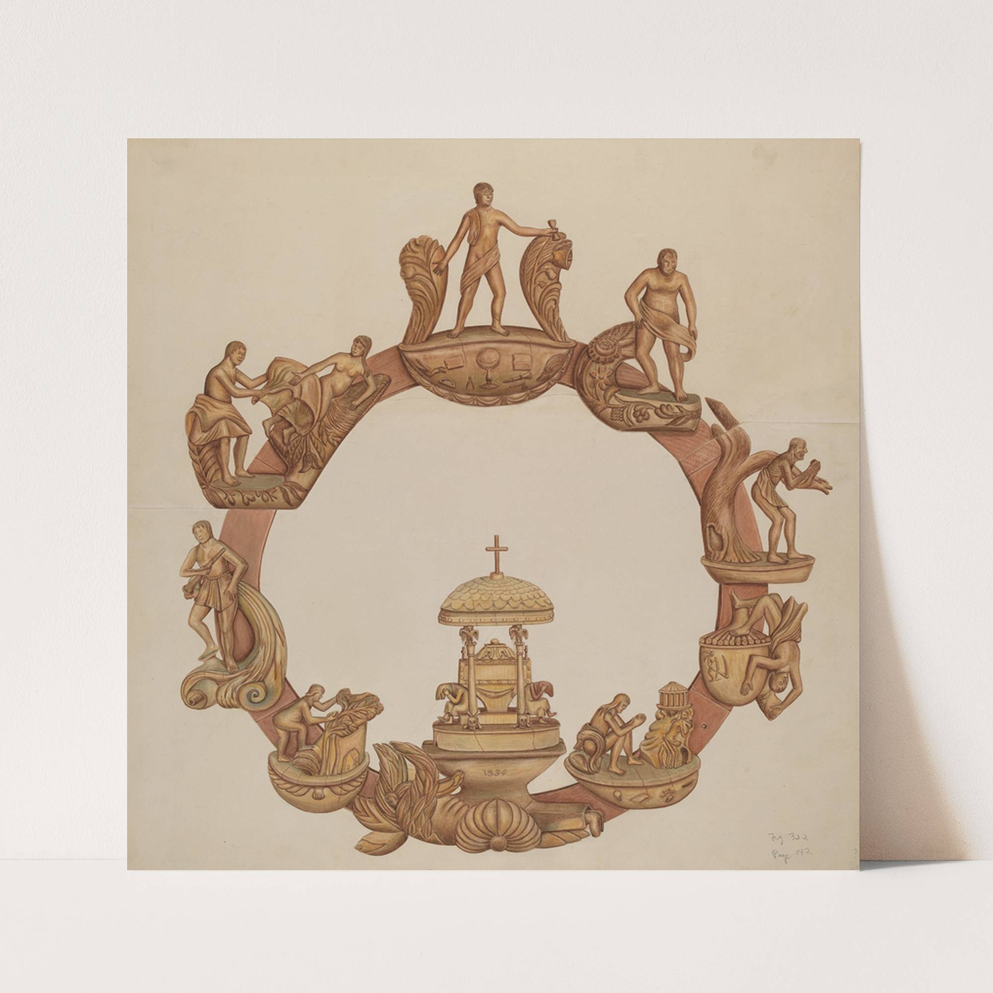 This art print features the intricate "Cycle of Life" carving by Al Curry, showcasing a richly detailed circular composition in earthy browns and muted golds. The centerpiece is a classical altar with an ornate, domed canopy topped by a cross,...