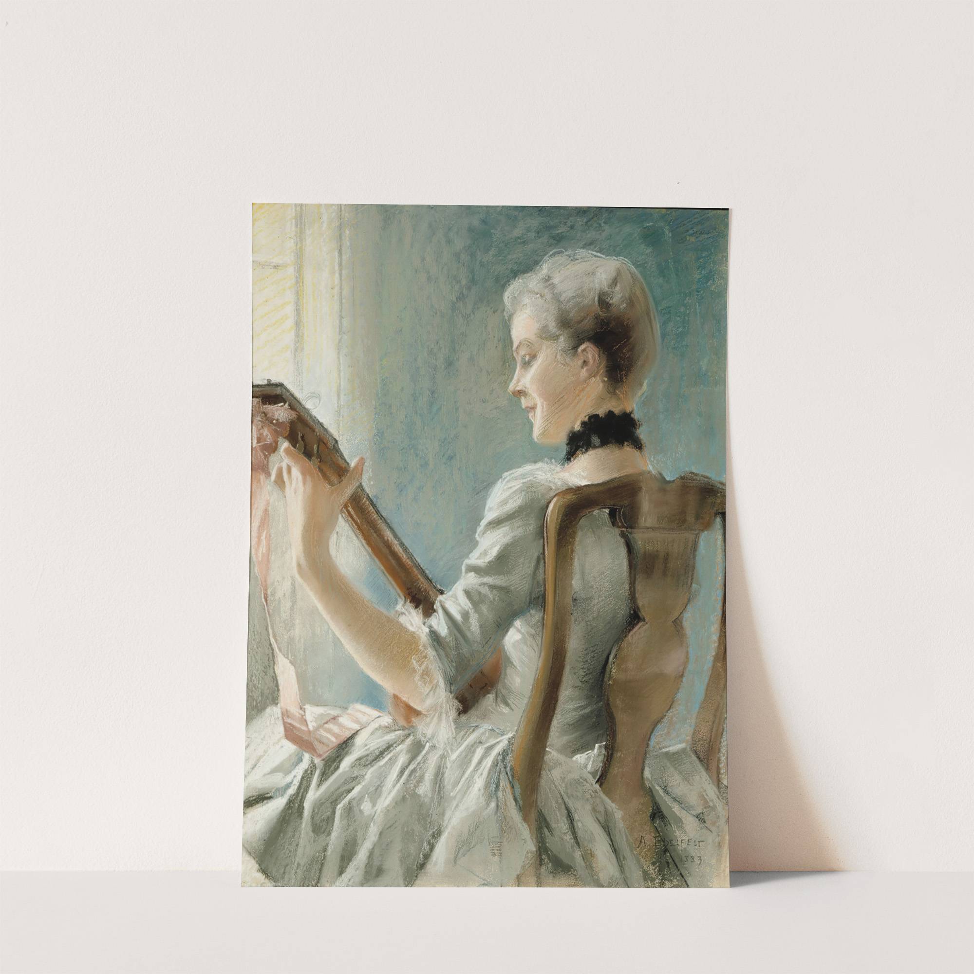 This exquisite print captures the delicate beauty of "Dalí's Spring Song" by Albert Edelfelt. The artwork features a young woman seated on an elegant wooden chair, gently holding onto a curtain that lets in soft light. Her elegant white gown,...