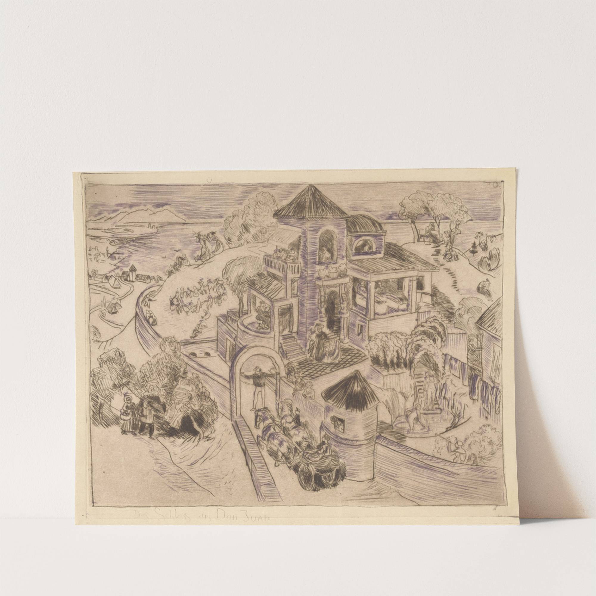 This striking black-and-white linocut print by Swiss artist Albert Welti, titled "Das Schloss des Don Juan" from 1910, showcases an intricate, detailed depiction of a grand villa surrounded by lush, winding landscapes. The architectural structure features prominent arches and multiple-tiered...