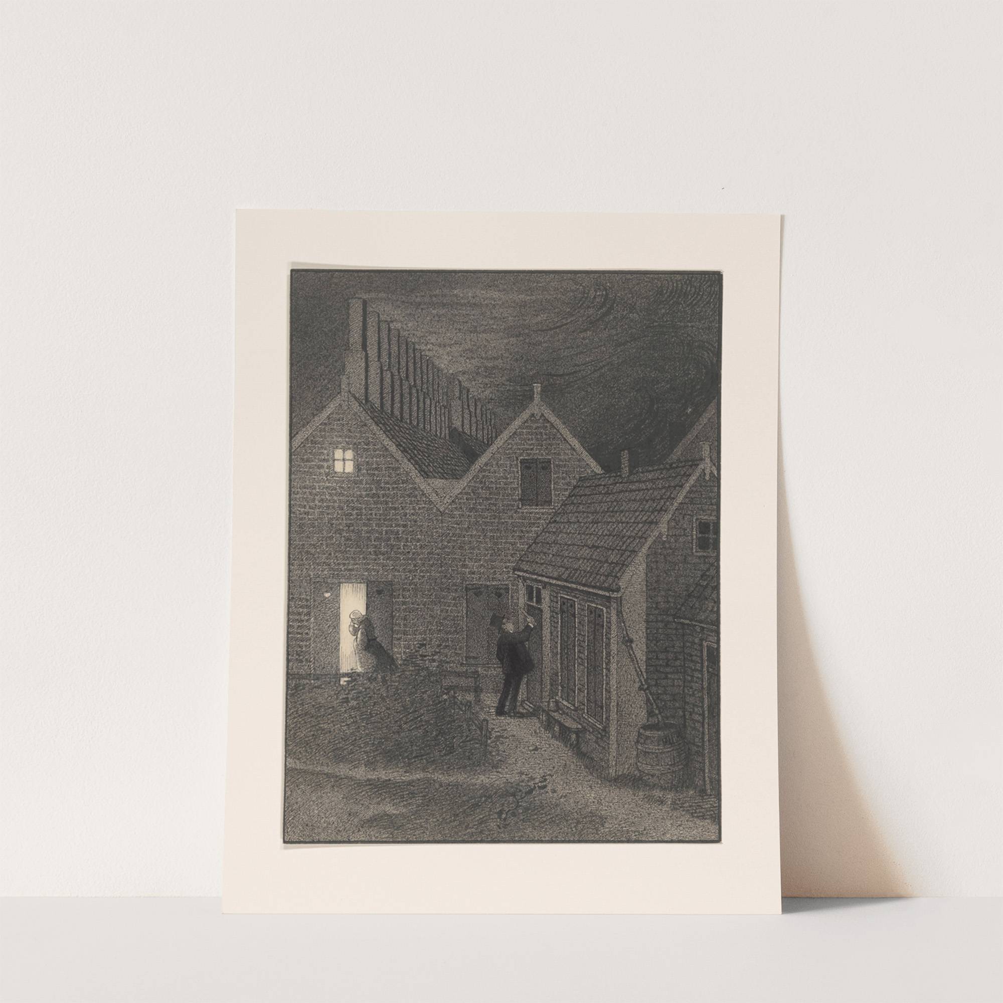 This monochromatic artwork by Albert Hahn, titled "De Aanzegger," captures the eerie yet intriguing atmosphere of a nighttime village scene. The piece is rendered in grayscale with meticulous detailing, showcasing traditional European brick houses with steep gabled roofs and tall...