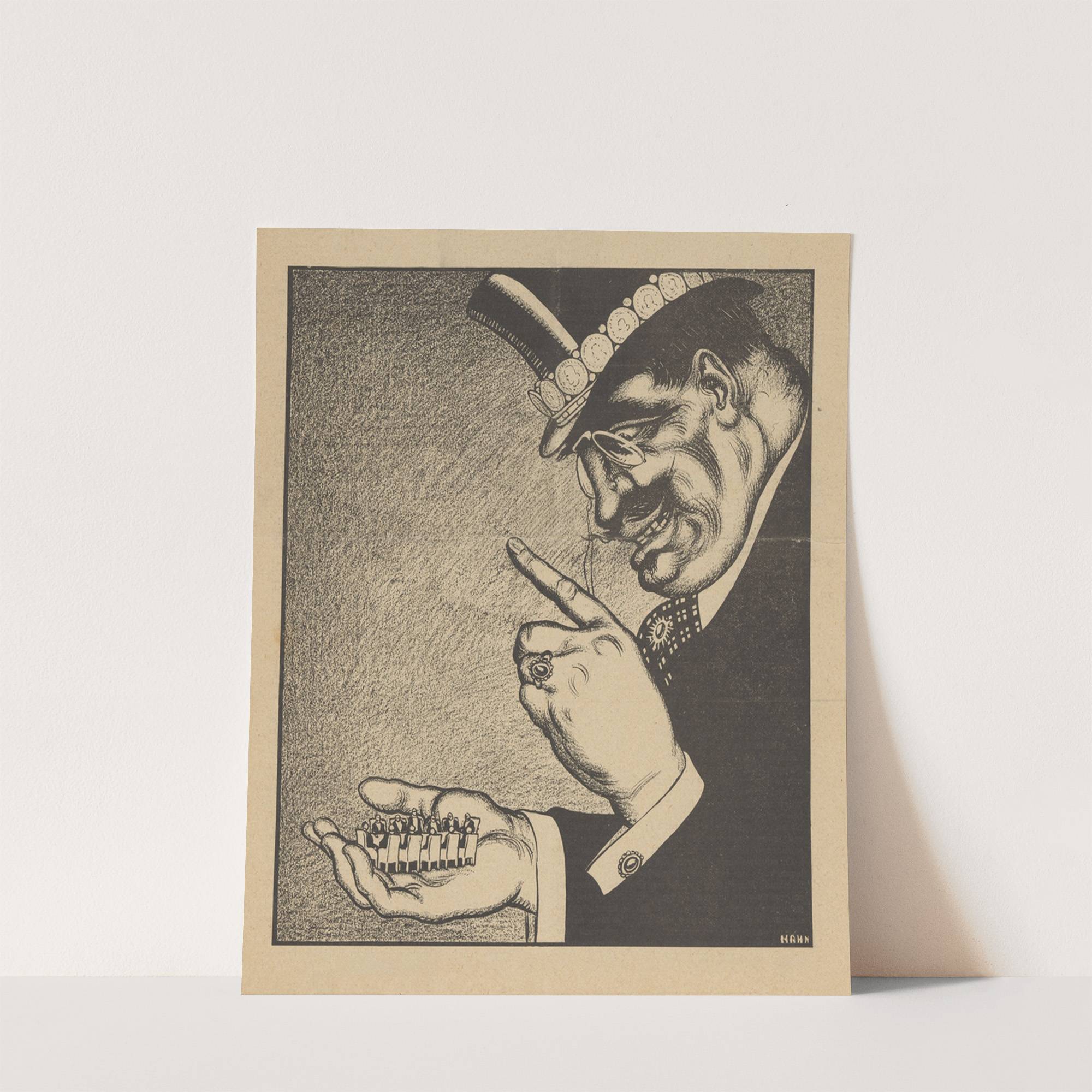 This black-and-white linocut print by the artist "De Notenkraker" titled "De 'Vrede'-conferentie" by Albert Hahn captures a humorous yet poignant moment. The image features a caricatured official, identifiable by his tall, black top hat adorned with white roses and round...