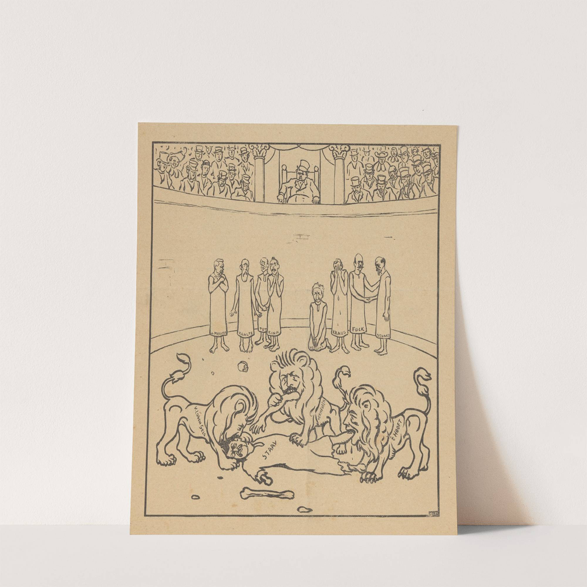 This black-and-white line art print depicts an ancient-style gladiator scene with striking detail. In the foreground, two fierce lions engage in a struggle over a bone, their expressive faces and muscular forms creating a dynamic composition. One lion has its...