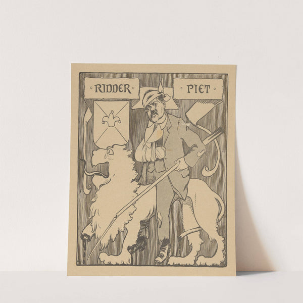 This striking illustration features "Rider Piet," a classic piece by artist De Notenkraker, created on October 19, 1907. The artwork is rendered in a monochromatic sepia tone, with intricate black linework that brings out the details of this vintage-style drawing....
