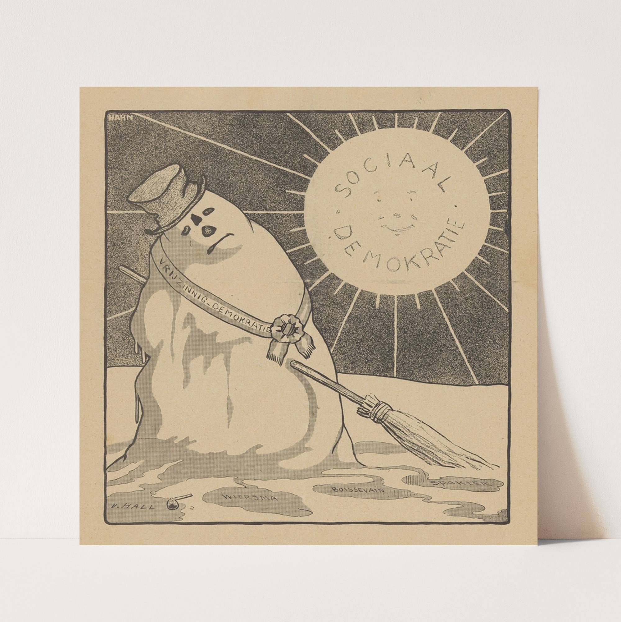 This art print features a charming, sepia-toned drawing by the artist De Notenkraker, titled "De Wegsmeltende Vrijzinnig-Democratie" from July 20, 1907. The central subject is an endearing snowman standing in a snowy landscape under a radiant moon. The snowman has...