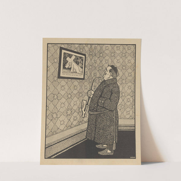 This art print, titled "Verjaardag-overpeinzing" by artist Albert Hahn, features an intricate black-and-white illustration with a vintage feel. The central figure is a stout man standing in a room adorned with patterned wallpaper that has a diamond-like design. He wears...