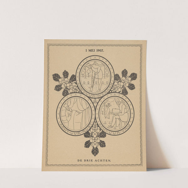 This elegant art print features three detailed line illustrations set in a traditional, vintage style. The central composition includes three circular medallions arranged in a triangular pattern, each depicting distinct scenes. The upper medallion shows a man standing with his...