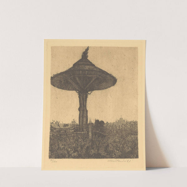 This beautifully rendered print features "De paraplu" by Arend Hendriks, capturing the intricate details of a tall palm tree with a thatched umbrella-like crown. The artwork is executed in sepia tones, highlighting the delicate interplay between light and shadow. The...