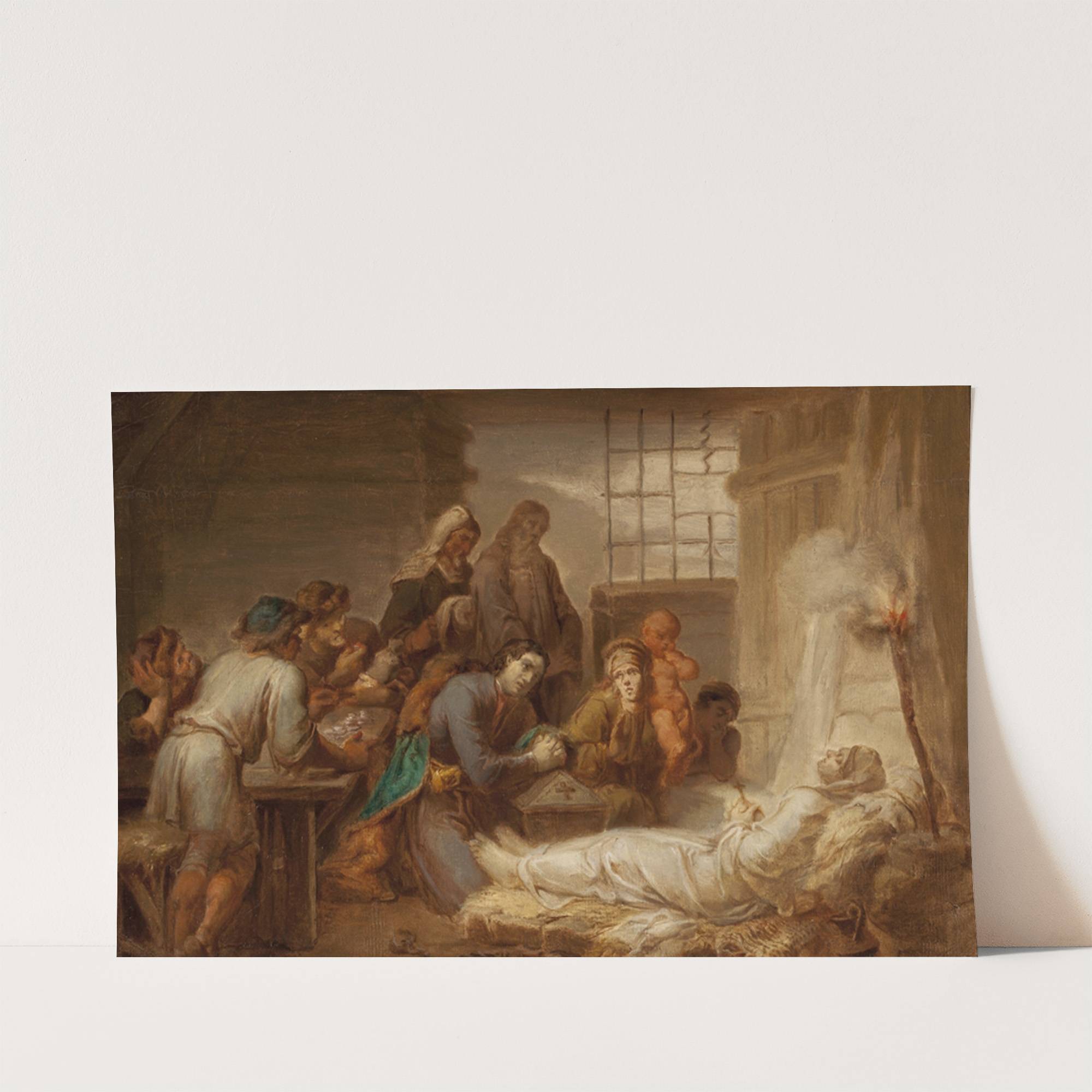 This art print features "Death in Exile" by Aleksander Kotsis, an evocative oil painting rich with emotional depth and historical detail. The composition centers around a somber scene where several figures surround a lifeless body laid out on a simple...
