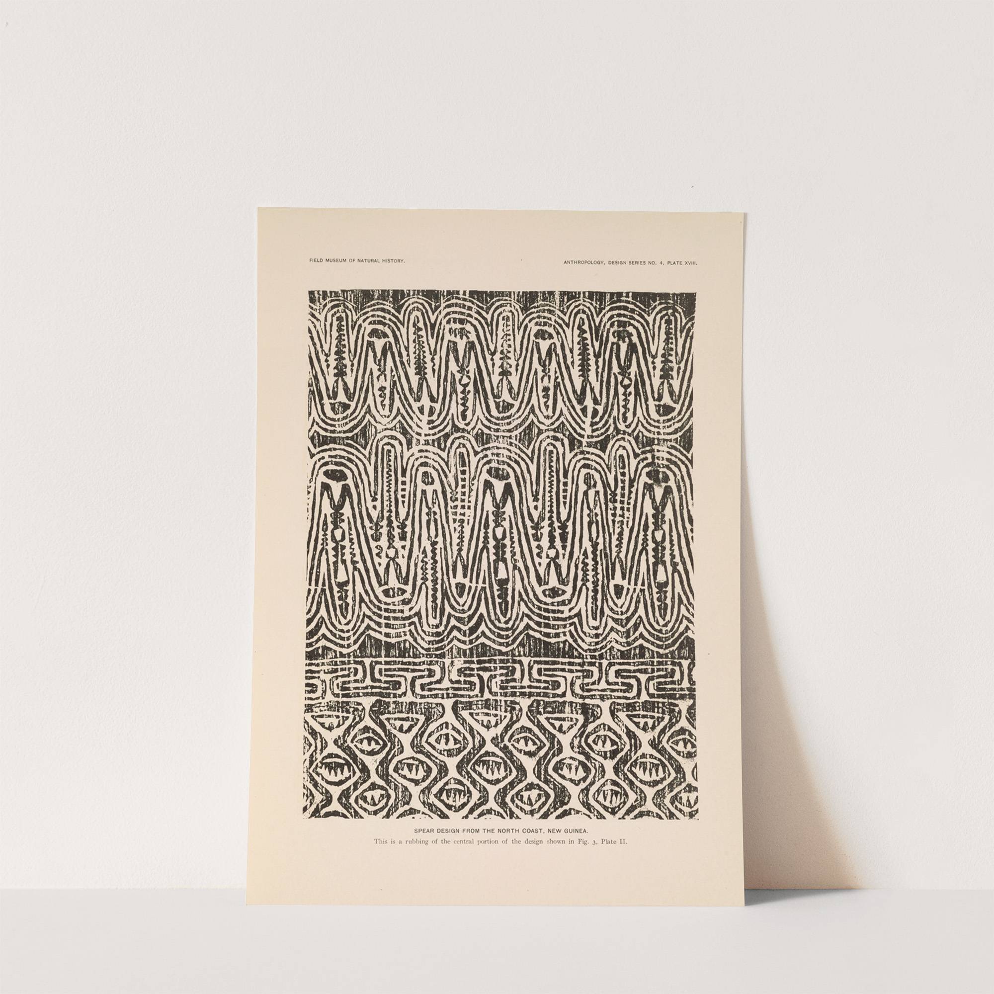 This art print features "Decorative Art of New Guinea Pl.16" by the renowned artist Albert Buell Lewis. The piece showcases an intricate black and white pattern, reminiscent of traditional Papuan tribal designs. The central focus is a repetition of abstract,...
