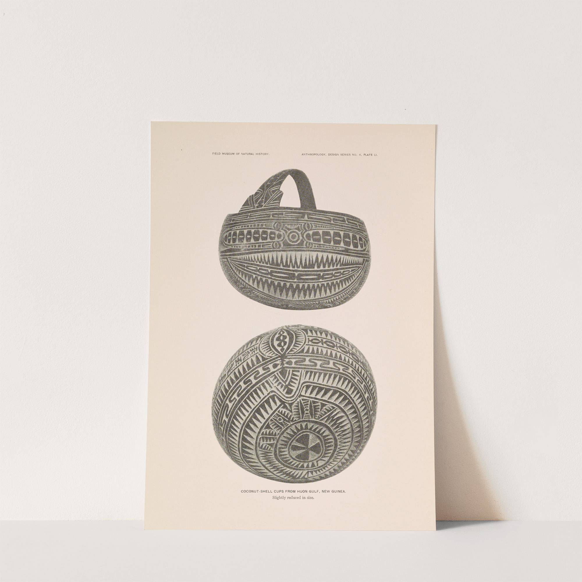 This art print features two intricately detailed New Guinean baskets, meticulously illustrated by artist Albert Buell Lewis. The upper basket is shown from the front view, showcasing a rich tapestry of geometric patterns in black and white. Its handle is...