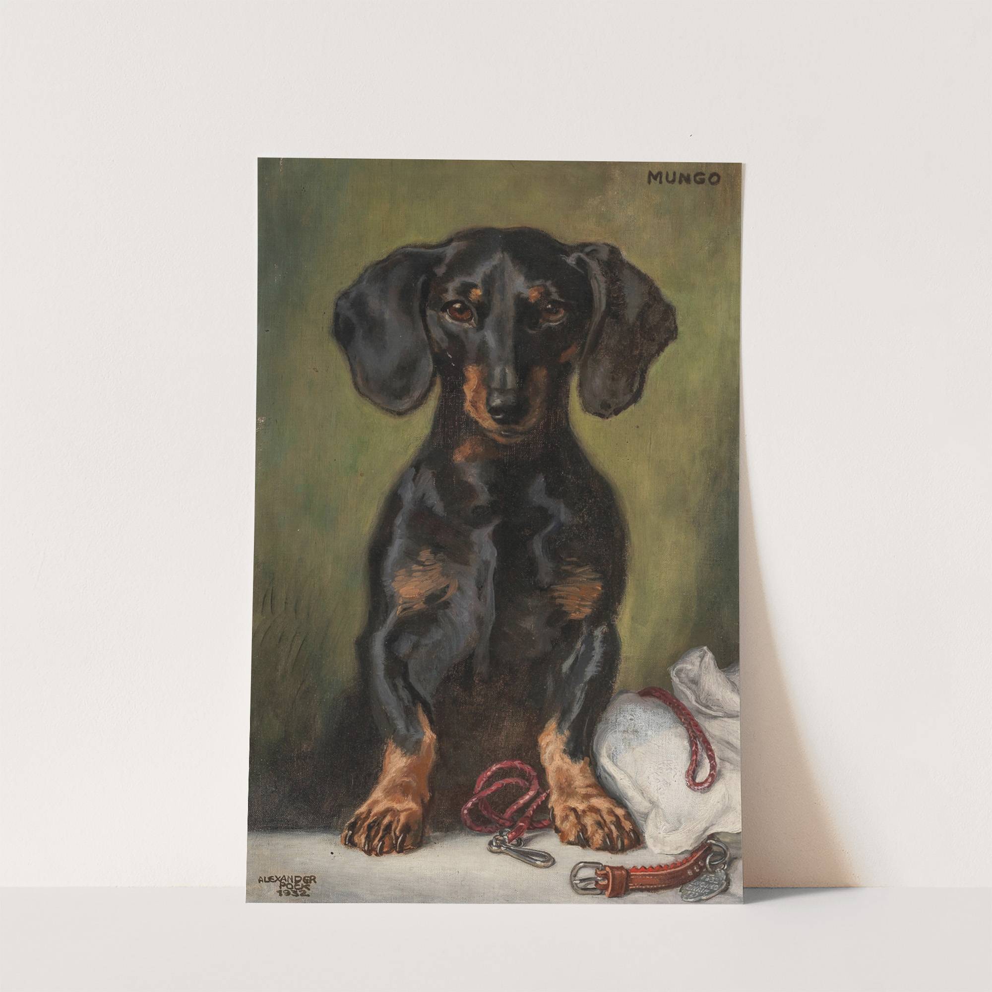 This evocative painting by Alexander Pock captures the endearing essence of a Dachshund with "Der liebe, süße, kluge, fröhliche, treue Mungerl." The dog sits upright and gazes directly at the viewer, showcasing its expressive brown eyes and soft black coat...