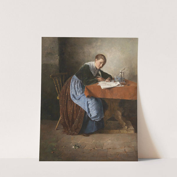 This beautifully painted piece titled "Der Liebesbrief" by Adolf Hölzel captures an intimate moment of focused concentration and quiet devotion. The subject is a young woman with fair skin and brown hair, modestly pinned back in soft waves. She leans...