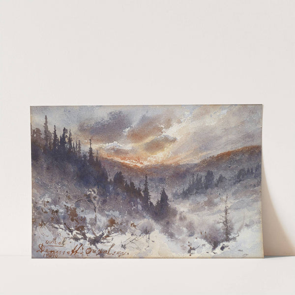 This beautiful landscape painting, titled "Der Ural" by artist Alexei Kuzmich Denisov-Uralsky, captures the serene beauty of a winter mountainscape at sunset. The painting features a delicate watercolor technique that brings together dark, moody tones with vibrant highlights to create...
