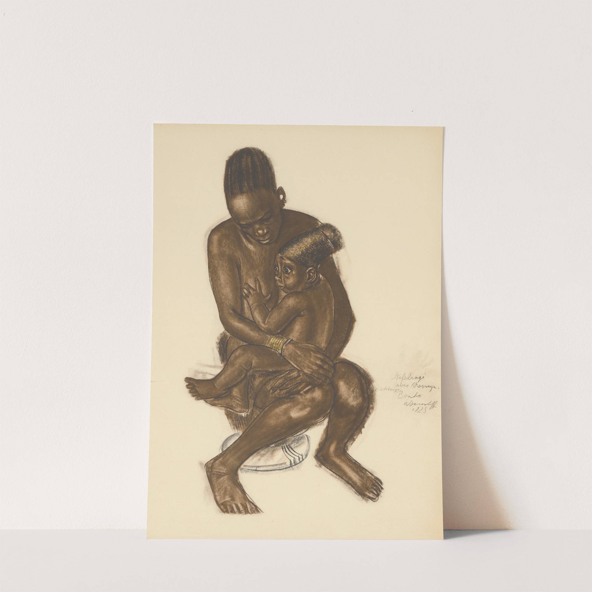 This beautiful art print features "Dessins et peintures d’Afrique pl 35 (1927)" by Alexandre Jacovleff, beautifully capturing an intimate moment between two African figures. The artwork showcases a mother and child in a tender embrace, rendered in rich sepia tones...