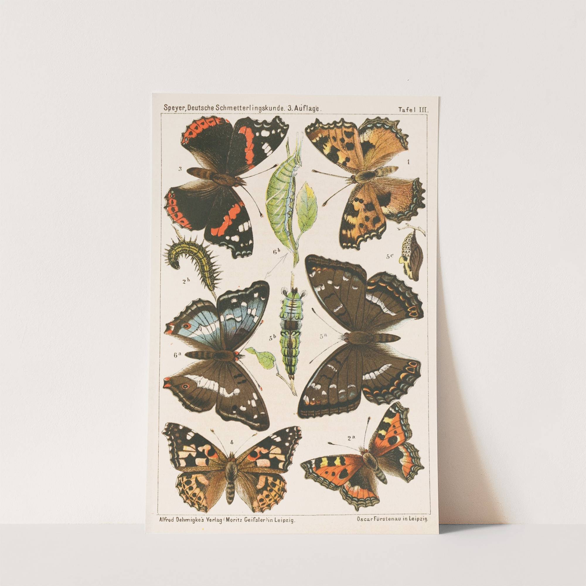 Discover the intricate beauty of butterflies with this detailed art print titled "Auge und Flügel der Tag-und-Nacht-Mimenschen," created by artist Adolf Speyer in 1883. This vibrant illustration features ten meticulously depicted butterflies, each showcasing unique patterns and colors. At the...