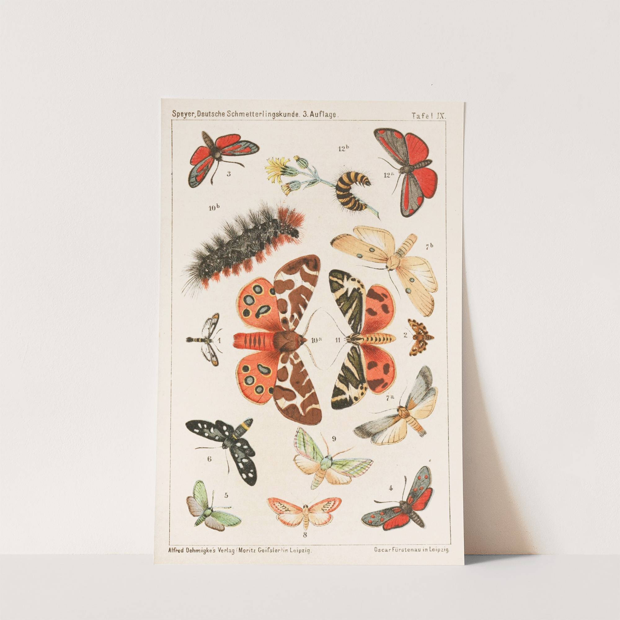 Introduce your art collection with "Sperber Dammlingskunde für Anfänger" by Adolf Speyer, a detailed and vibrant illustration of various butterfly species. This print showcases an array of butterflies against a clean white background, each meticulously depicted in colorful detail.The center...