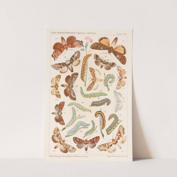 Discover the intricate beauty of nature with this exquisite art print titled "Deutsche Schmetterlingskunde für Anfänger" by Adolf Speyer, created in 1885. This detailed illustration showcases a variety of butterfly and moth species, each meticulously rendered to highlight their unique...