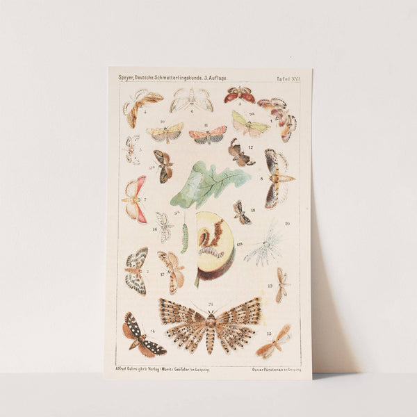 This art print showcases "Symphyedus Valentinipupillating Fig. 11-25" by Adolf Speyer, dated 1832. The artwork is a detailed illustration of various butterflies and moths from the family Macrolepidopterina. Each insect is meticulously drawn in vibrant colors against a white background,...