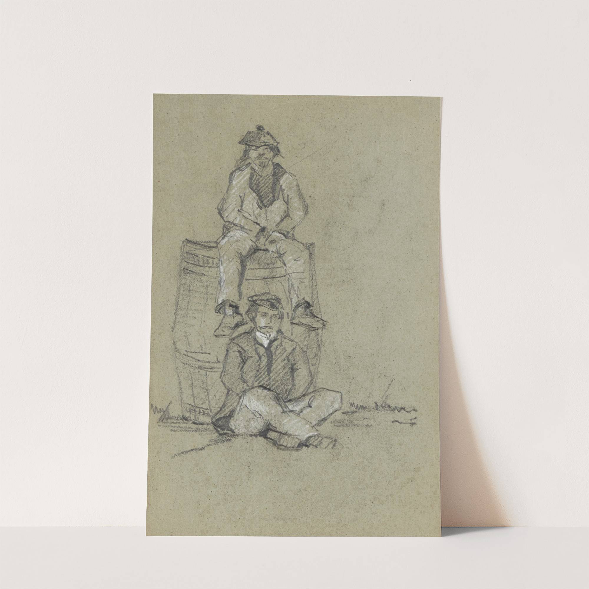 This charming pencil sketch features two men in period attire, evoking an old-world rustic feel. The man seated at the top is perched on an empty wooden barrel, his legs casually crossed, exuding a relaxed demeanor. He wears a hat...