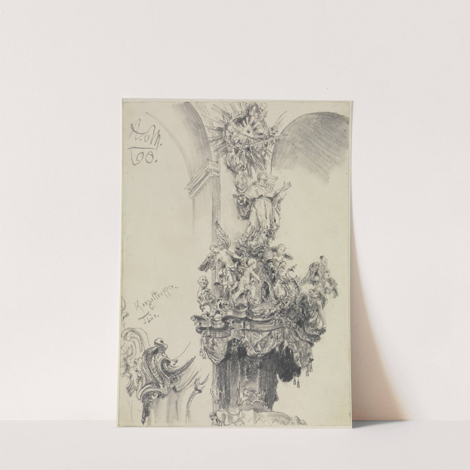 This striking monochrome sketch features "Die Bekrönung der Kanzel der Augustinerkirche in Würzburg" by the renowned artist Adolph von Menzel. Rendered in intricate pencil work, this artwork captures a dynamic scene from the baroque era. Central to the composition is...