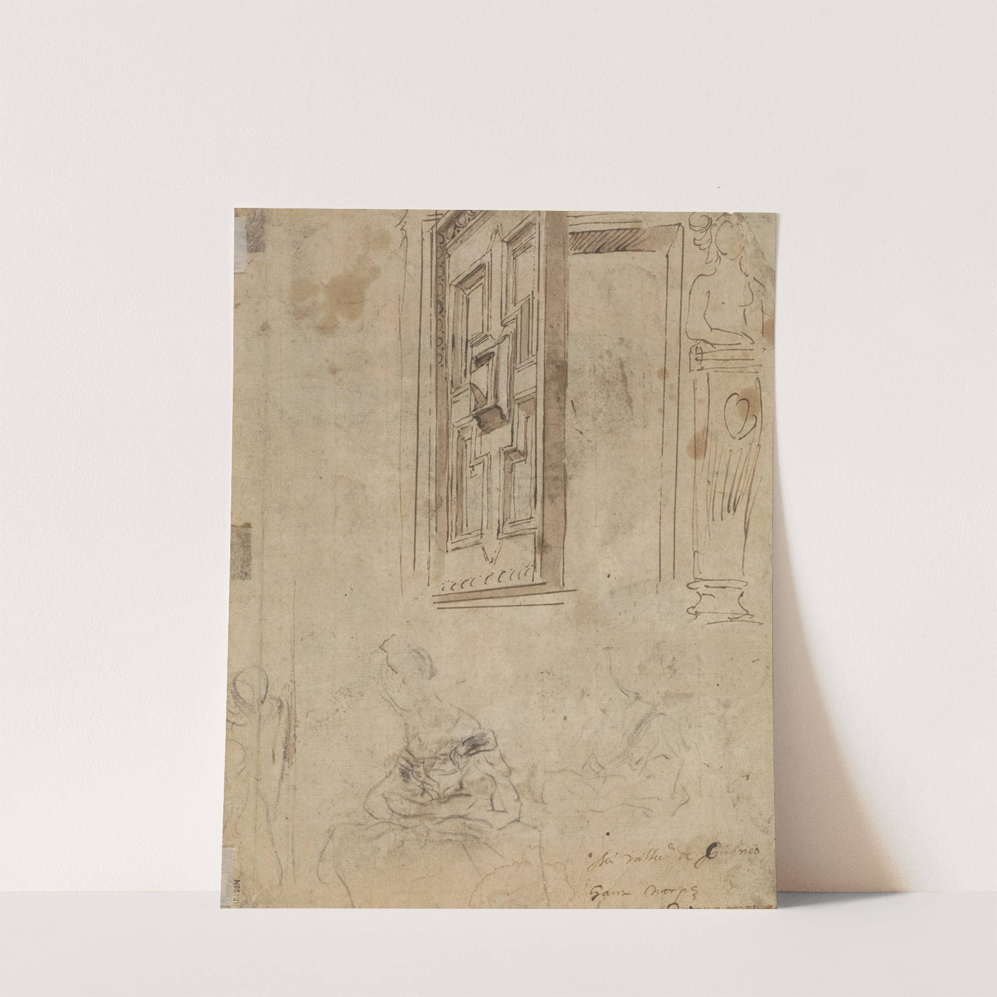 Die Heilige Familie mit Elisabeth und dem Johannesknaben (Rückseite- Tür, Türöffnung und Herme) by Jacob Jordaens - Wall Art Print