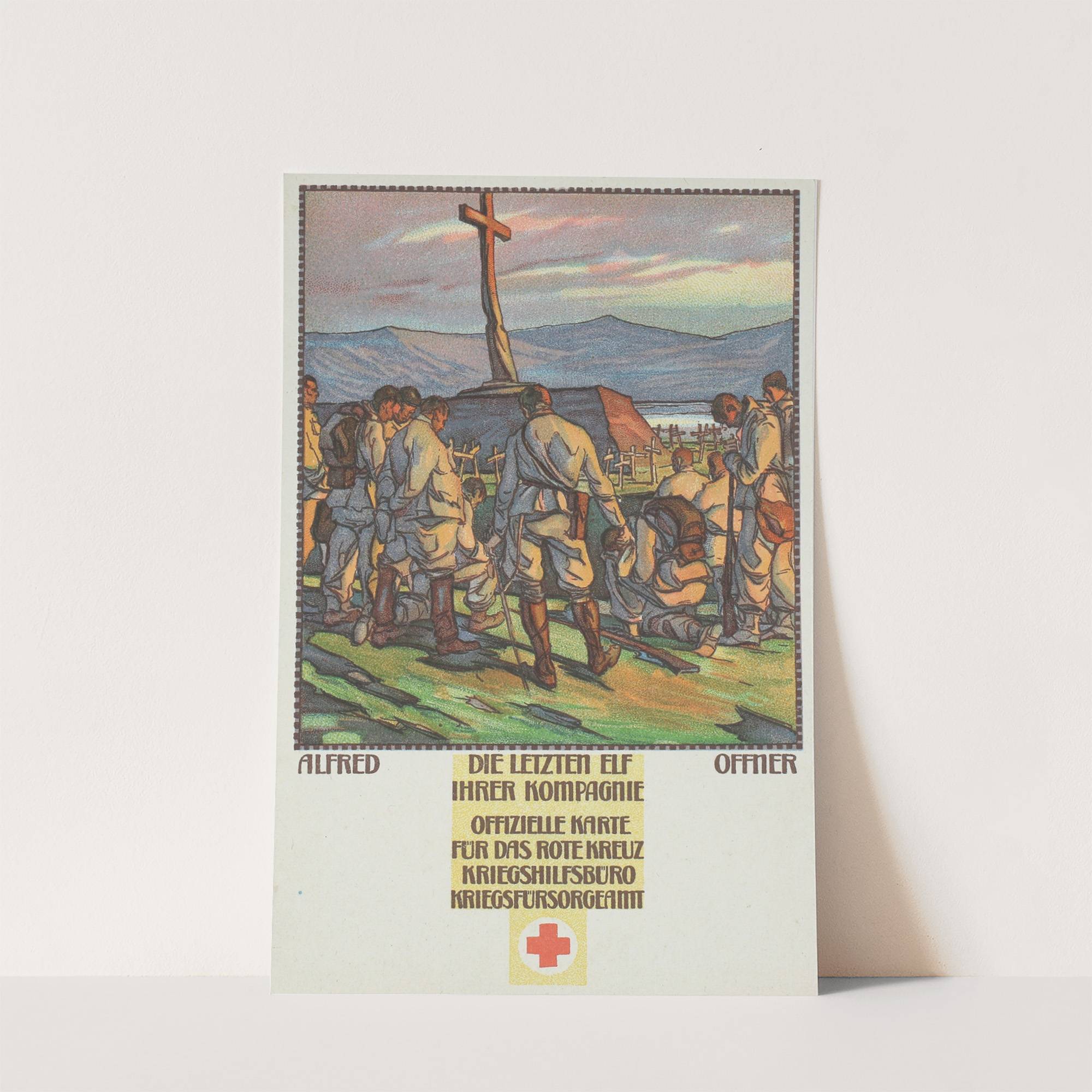 This striking art print depicts "Die letzten Elf ihrer Kompagnie" by Alfred Offner, created in 1915. The vivid scene portrays a group of eleven soldiers marching solemnly towards their graves under the supervision of a tall wooden cross. Painted in...