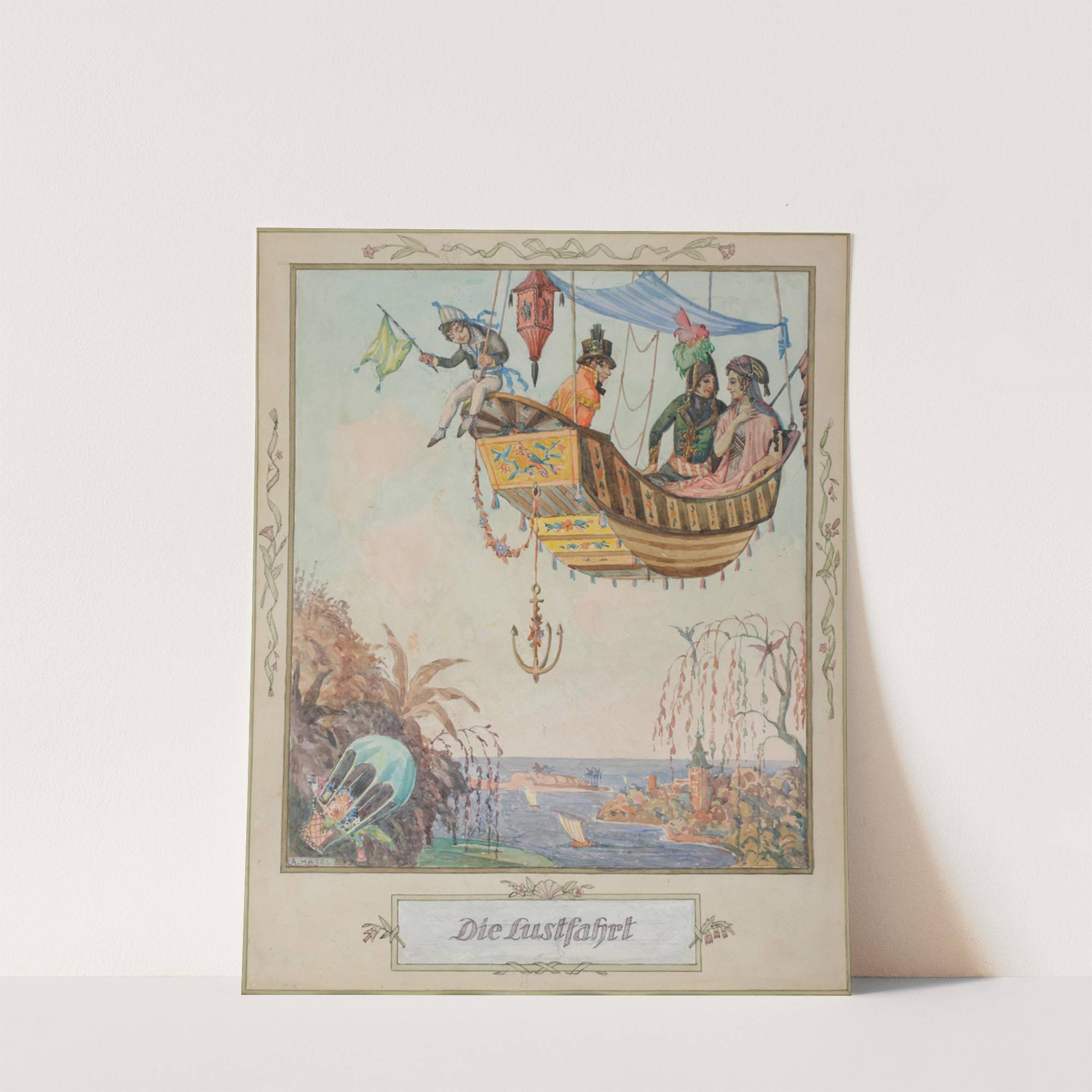 This exquisite print features "Die Lustfahrt" by Alfred Henselt, showcasing a whimsical Victorian-era illustration with rich colors and intricate details. The scene depicts a fantastical hot air balloon ride adorned with colorful flags and lanterns. Four elegantly dressed passengers, including...