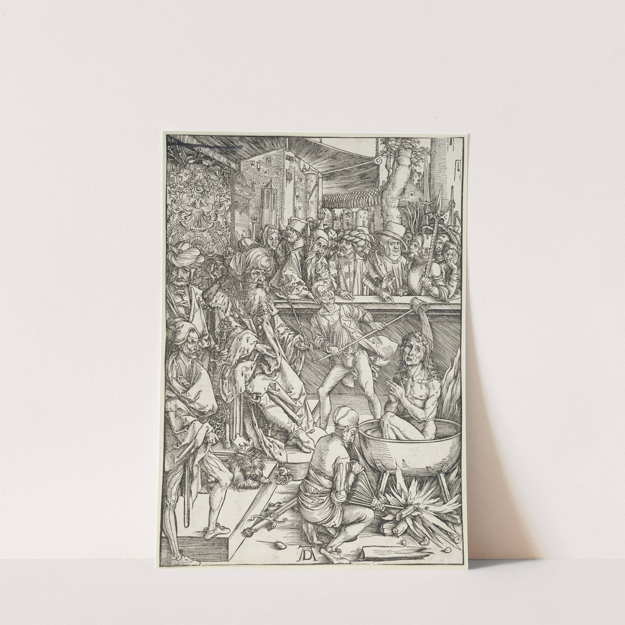 Experience the detailed masterwork of Albrecht Dürer with "Die Marter des Evangelisten Johannes" – an intricate black-and-white etching that brings a powerful biblical scene to life. This artwork showcases the martyrdom of John the Evangelist in dramatic, expressive detail. The...
