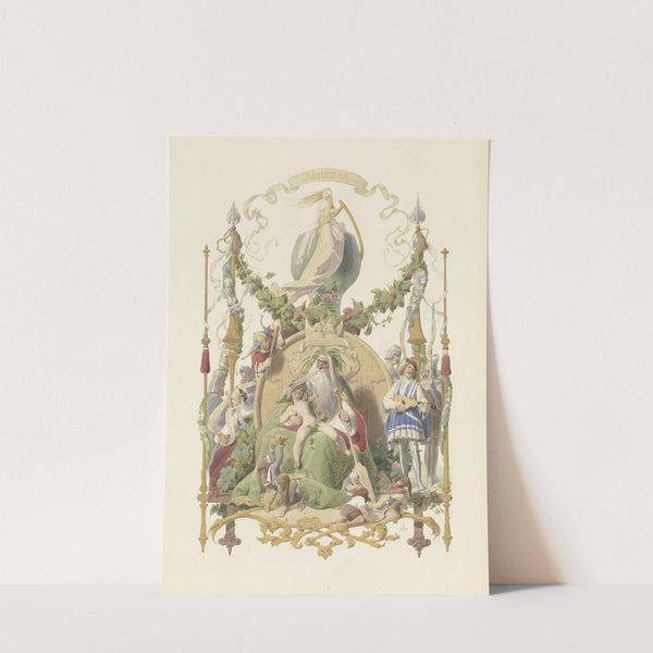This exquisite art print features "Die vier Hauptgetränke: Rheinwein" by Adolf Schröter, showcasing a meticulously detailed, vintage-style illustration. At the center, a regal mermaid with flowing green hair and scales wears a delicate crown of white flowers, sitting gracefully with...