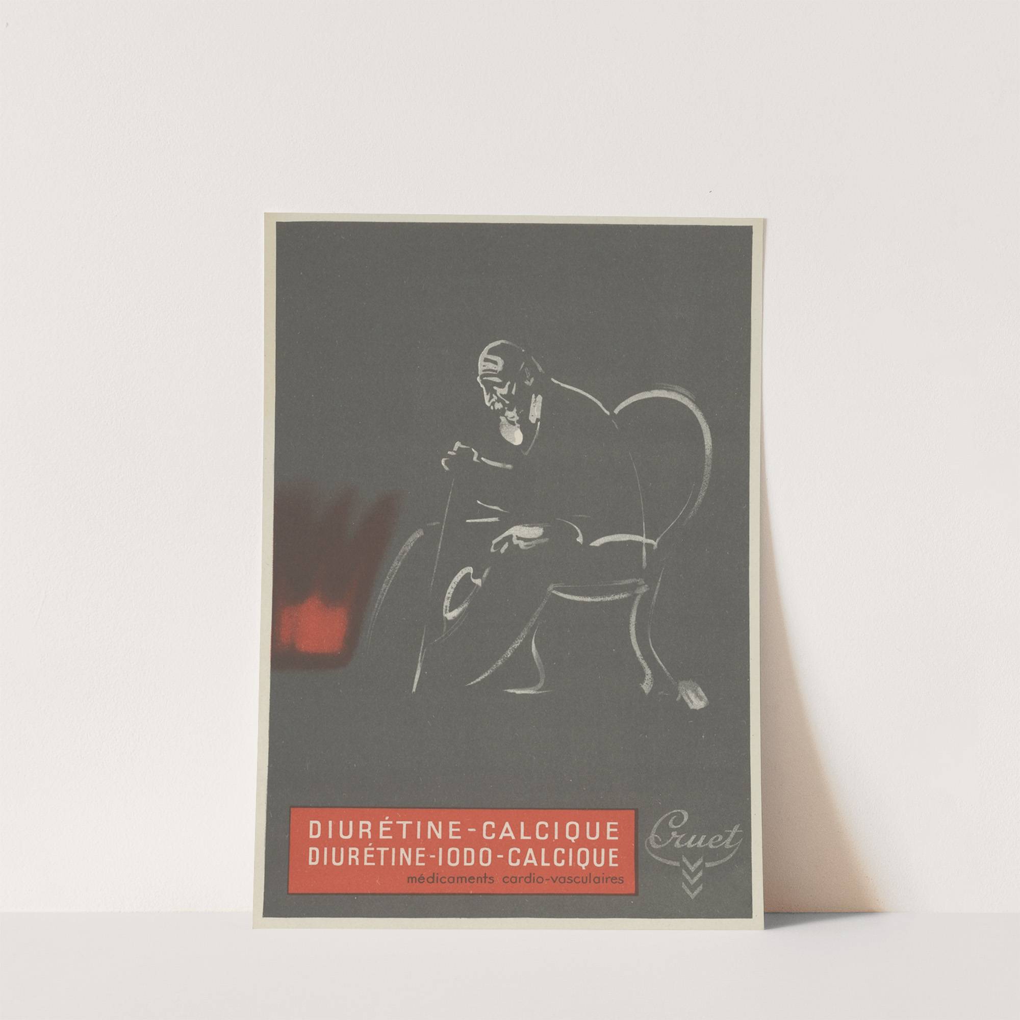 This striking art print showcases "Diurétine-calcique, Diurétine-iodo-calcique (1910-1950)" by artist Cruet. The image is executed in a modern, minimalist style with bold, white line work set against a dark, charcoal-gray background. A muscular figure, likely male given the robust build...