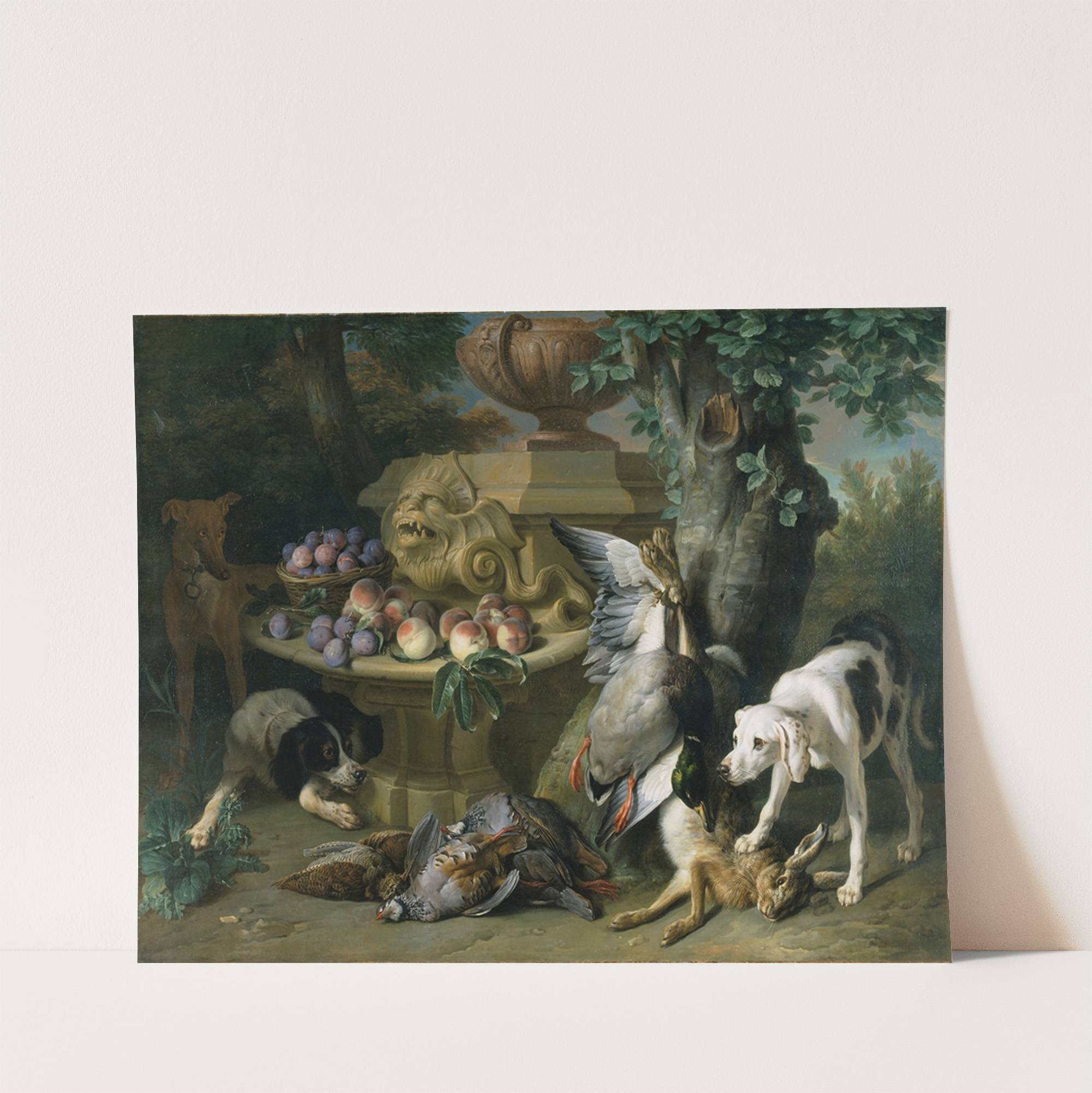 This stunning art print captures "Dogs, Dead Game and Fruit" by Alexandre François Desportes, a masterpiece of Baroque realism. The scene is rich with vibrant life and intricate detail. At the center, a classical stone fountain holds a bounty of...