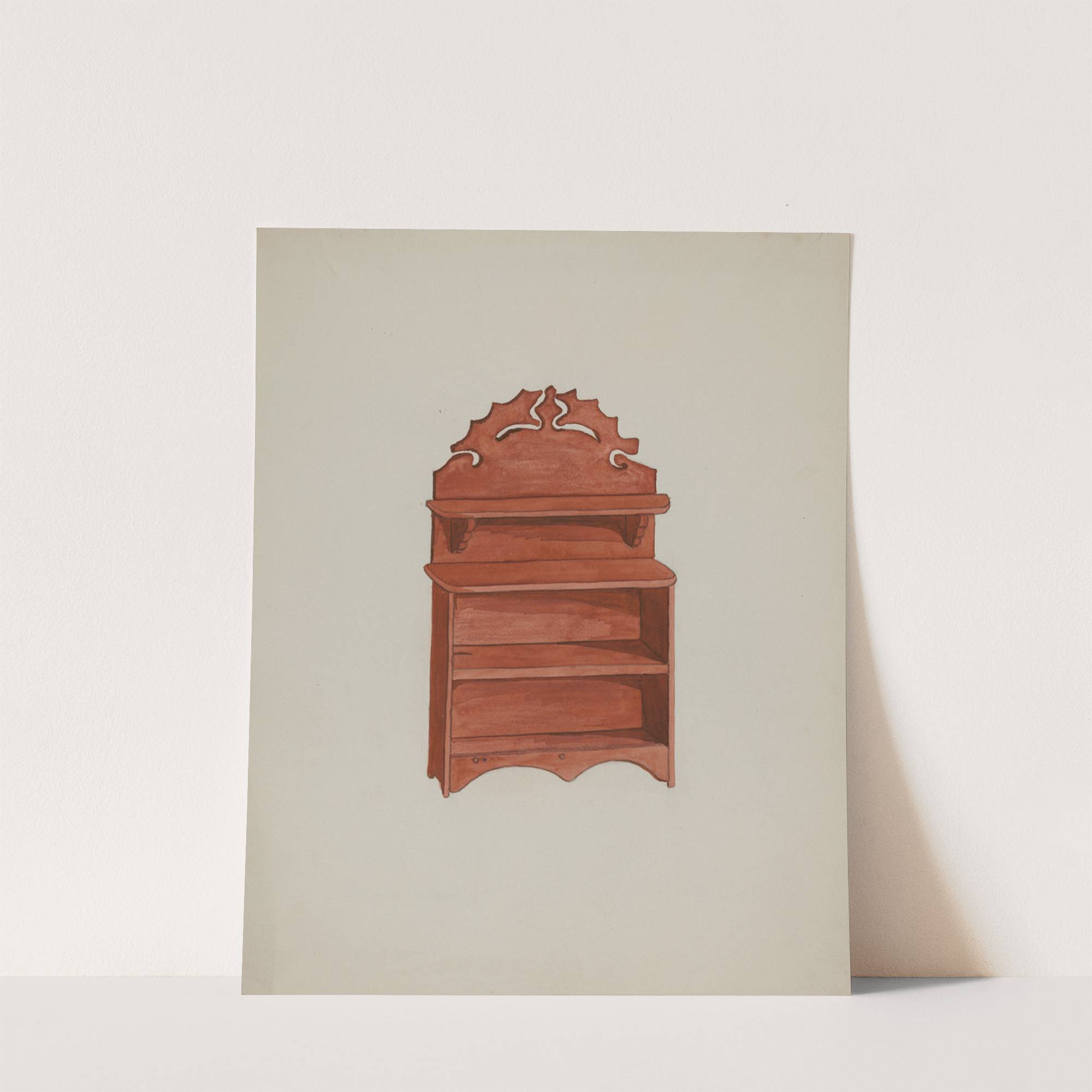 This elegant piece of wall art captures the charming detail of a vintage wooden sideboard. The artwork features a rich, warm red color with a smooth finish that highlights the natural wood grain texture. The sideboard is depicted in an...