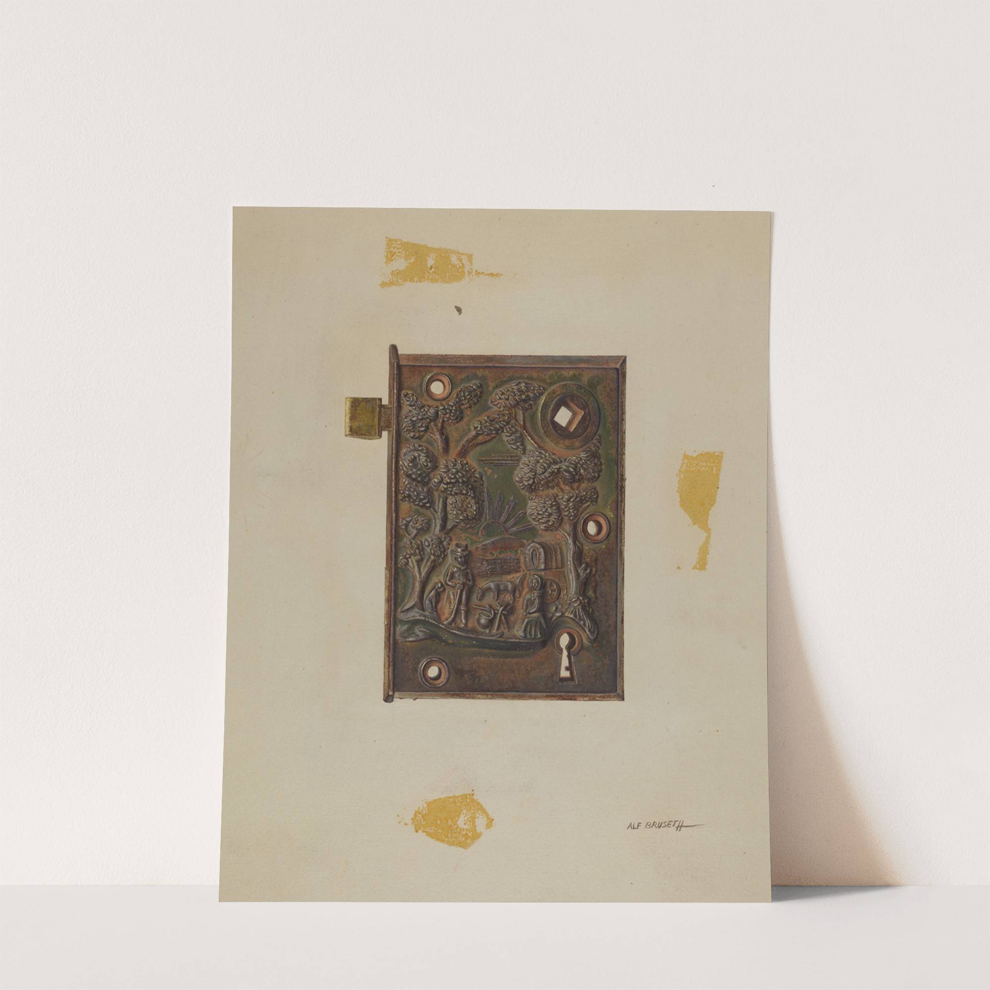 This artwork features "Door Lock" by Alf Brochet, showcasing a detailed bronze lock with intricate engraving. The lock is adorned with relief sculptures of trees and foliage that extend across its surface, creating a naturalistic scene. At the center of...