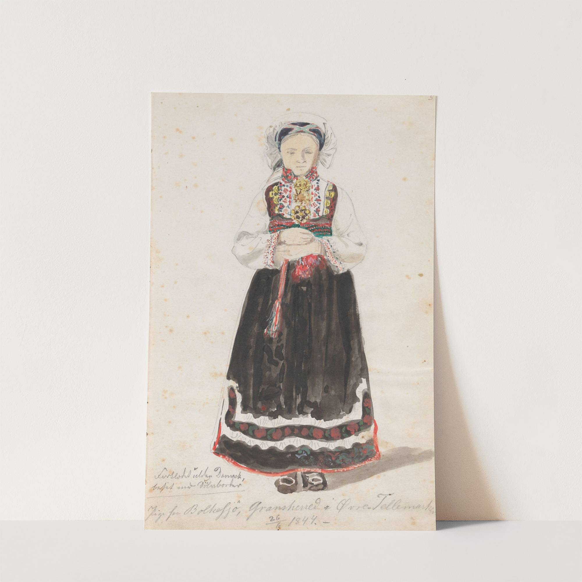 This beautifully rendered watercolor print, "Draktstudie, Bolkesjø" by Adolph Tidemand, depicts a traditional Norwegian woman in intricate detail. The subject stands gracefully with her hands gently clasped in front of her chest, wearing a black long skirt adorned with vibrant...