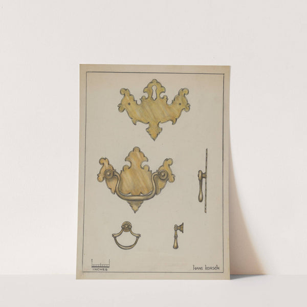 This art print features "Drawer Pull (c. 1936)" by Hans Korsch, showcasing detailed illustrations of traditional hardware components in warm yellow tones with subtle shading. The top part depicts an ornate escutcheon plate with elaborate scrollwork patterns, highlighting its classic...